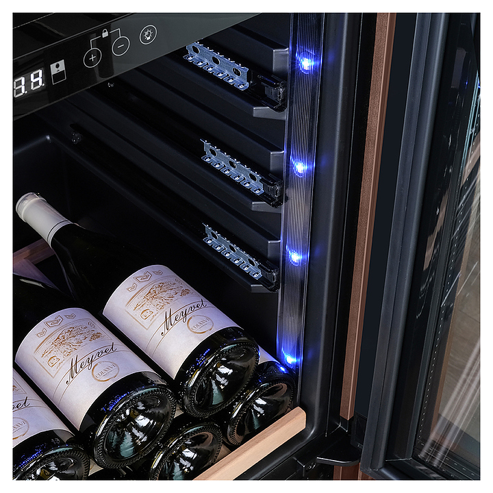 Винный шкаф MEYVEL MV77PRO-KBT2 предназначен для демонстрации, хранения и создания оптимальных условий для сохранения всех вкусовых свойств вина в бутылках на предприятиях общественного питания, торговли, в барах, ресторанах, специализированных магазинах, частных домах или квартирах. Модель оснащена интуитивно-понятной сенсорной панелью управления, электронным термостатом и внутренней светодиодной подсветкой. Корпус выполнен из стали с обшивкой из натурального шпона бука, дверь - из тройного стекла с УФ защитой, полки - из массива бука. Особенности: