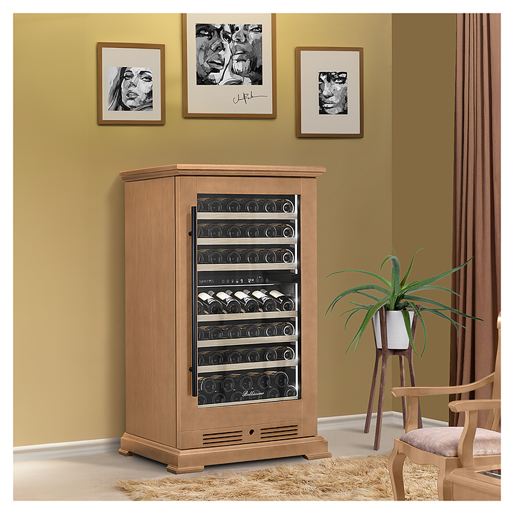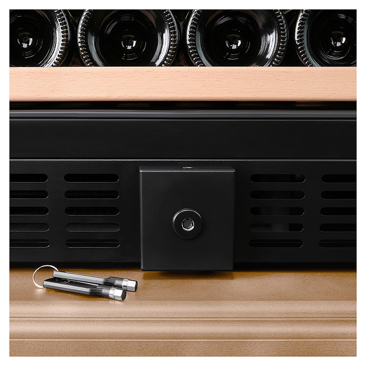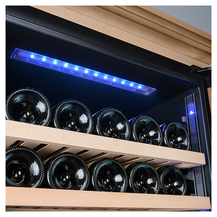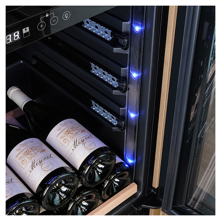 Винный шкаф MEYVEL MV77PRO-KBT2 предназначен для демонстрации, хранения и создания оптимальных условий для сохранения всех вкусовых свойств вина в бутылках на предприятиях общественного питания, торговли, в барах, ресторанах, специализированных магазинах, частных домах или квартирах. Модель оснащена интуитивно-понятной сенсорной панелью управления, электронным термостатом и внутренней светодиодной подсветкой. Корпус выполнен из стали с обшивкой из натурального шпона бука, дверь - из тройного стекла с УФ защитой, полки - из массива бука. Особенности: