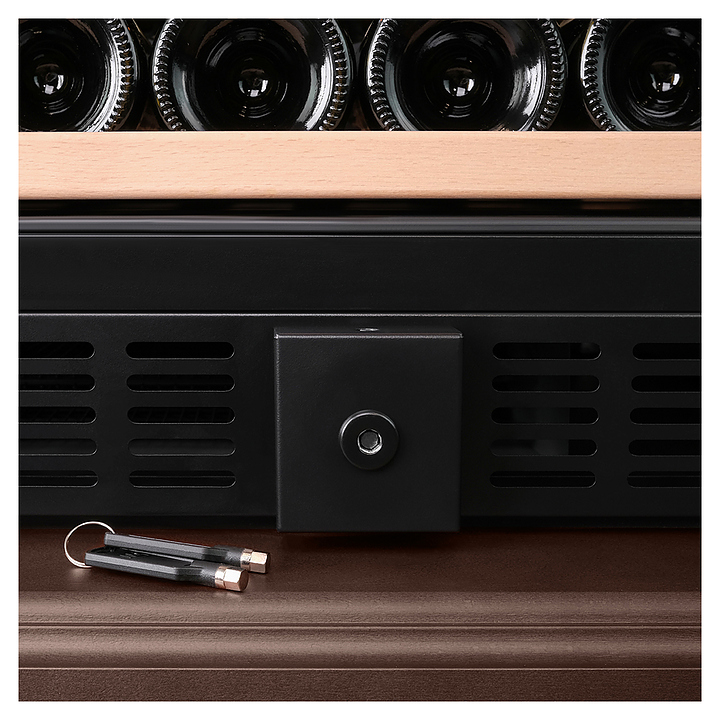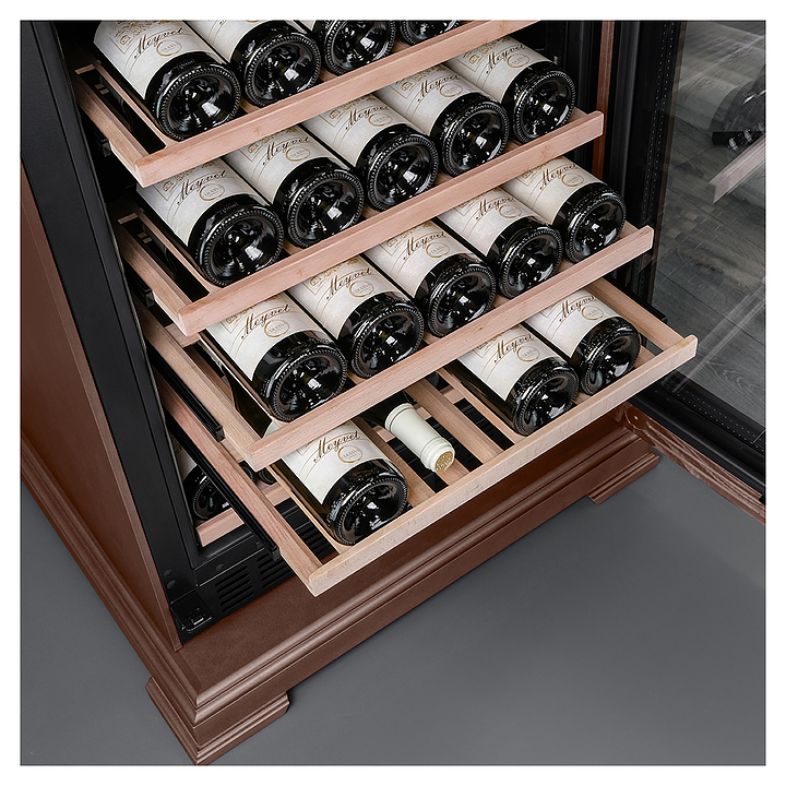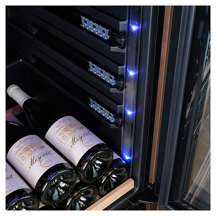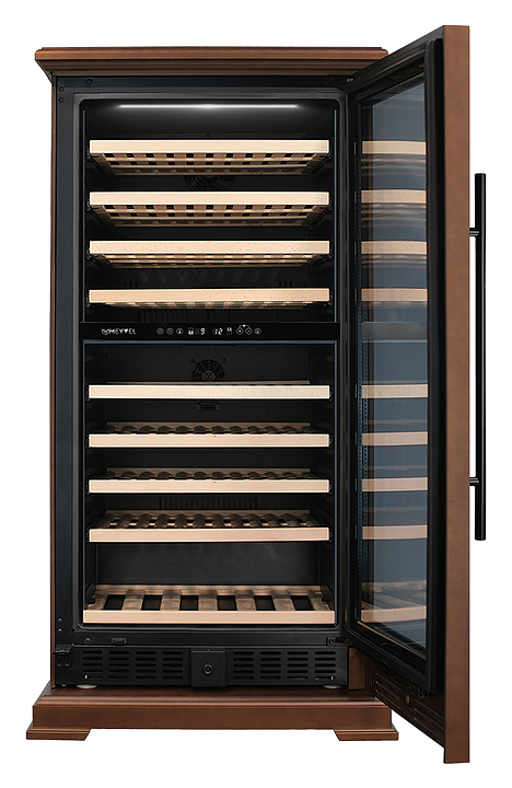 Винный шкаф MEYVEL MV99PRO-KBT2 предназначен для демонстрации, хранения и создания оптимальных условий для сохранения всех вкусовых свойств вина в бутылках на предприятиях общественного питания, торговли, в барах, ресторанах, специализированных магазинах, частных домах или квартирах. Модель оснащена интуитивно-понятной сенсорной панелью управления, электронным термостатом и внутренней светодиодной подсветкой. Корпус выполнен из стали с обшивкой из натурального шпона бука, дверь - из тройного стекла с УФ защитой, полки - из массива бука. Особенности: