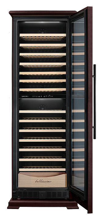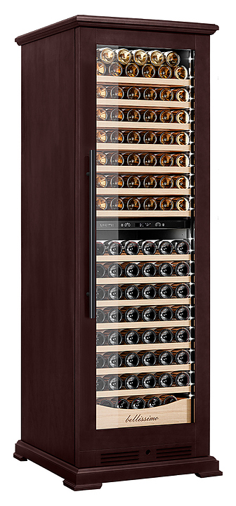 Винный шкаф MEYVEL MV163PRO-KBT2 предназначен для демонстрации, хранения и создания оптимальных условий для сохранения всех вкусовых свойств вина в бутылках на предприятиях общественного питания, торговли, в барах, ресторанах, специализированных магазинах, частных домах или квартирах. Модель оснащена интуитивно-понятной сенсорной панелью управления, электронным термостатом и внутренней светодиодной подсветкой. Корпус выполнен из стали с обшивкой из натурального шпона бука, дверь - из тройного стекла с УФ защитой, полки - из массива бука. Особенности: