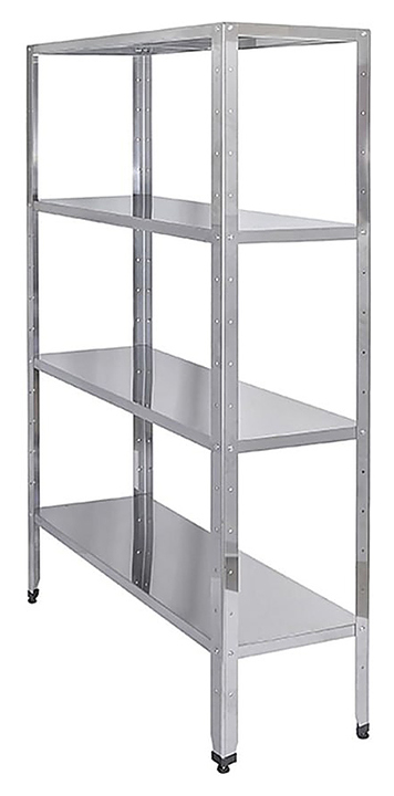 Кухонный стеллаж Braum СТ-16/5/180 предназначен для использования в производственных цехах предприятий общественного питания, супермаркетах, комбинатах пищевой промышленности для хранения столовой посуды, а также продуктов в подсобных помещениях. Модель оснащена 4 полками с П-образными ребрами жесткости. Стойки в форме уголка, полки и усиление полок выполнены из нержавеющей стали AISI 430. Дополнительные характеристики:
