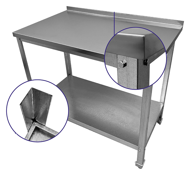 Стол производственный Abresto НСРБ-12070-УОПО предназначен для обработки различных продуктов и раскатки теста, а также хранения кухонной утвари на предприятиях общественного питания, в пекарнях, кондитерских и гипермаркетах. Модель оснащена бортом, полкой и регулируемыми по высоте опорами. Столешница выполнена из нержавеющей стали AISI 430 с усилением ЛДСП, рамка столешницы, полка и разборный каркас - из оцинкованной стали. Особенности: