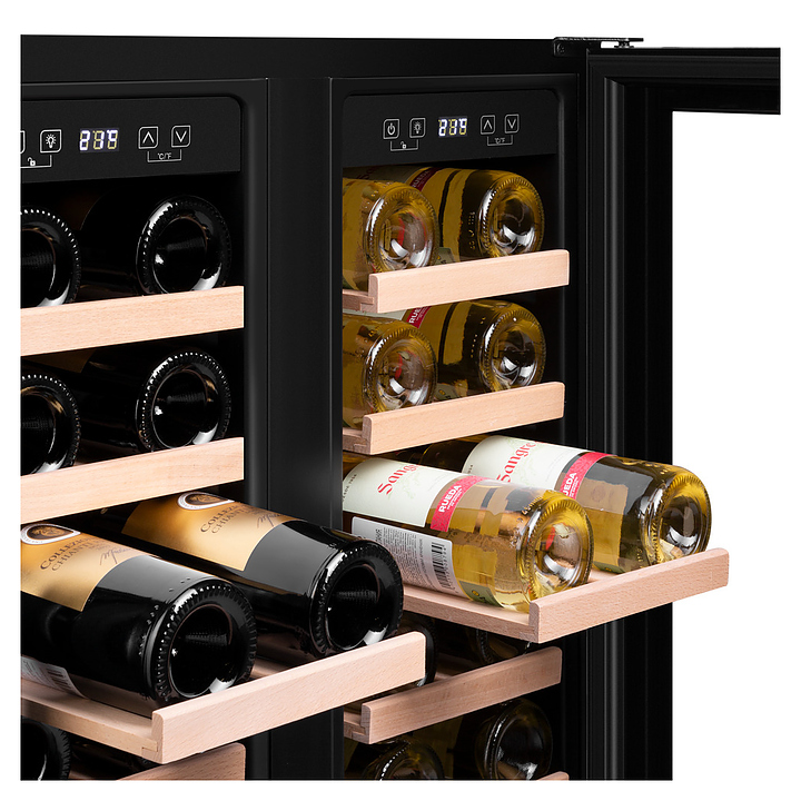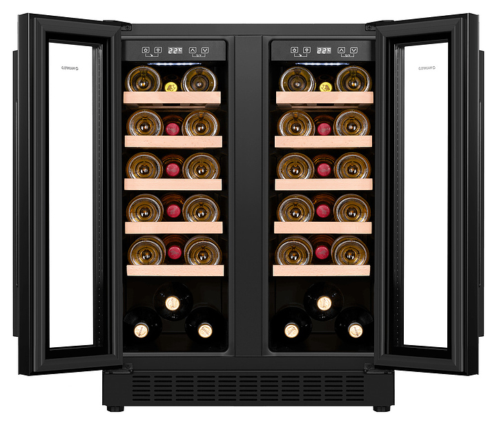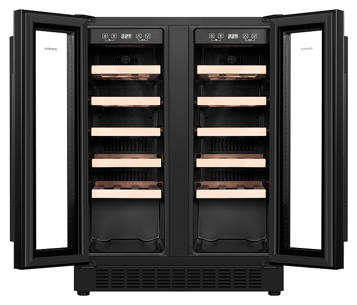 Винный шкаф Maunfeld MBWC-112S40 предназначен для хранения при оптимальных условиях и предпродажной демонстрации бутилированного вина различных сортов в барах, ресторанах, специализированных магазинах, подсобных складских помещениях, а также домашних условиях. Модель оснащена 2 холодильными камерами, каждая камера имеет распашную дверь с длинной уплощенной вертикальной рукояткой, расположенную внутри панель управления с функциональными сенсорными клавишами и светодиодным дисплеем с белой подсветкой индикации. Корпус выполнен из стали с антикоррозийным покрытием черного цвета, двери с полным фронтальным остеклением без винтового крепежа из прозрачного стекла с дымчатой тонировкой, внутренняя облицовка камер черного цвета, полки – из массива буковой древесины. В комплект поставки входят 10 съемных полок с направляющими для размещения бутылок, крепеж для рукояток, инструкция по эксплуатации, гарантийный талон и заводская упаковка. Особенности: