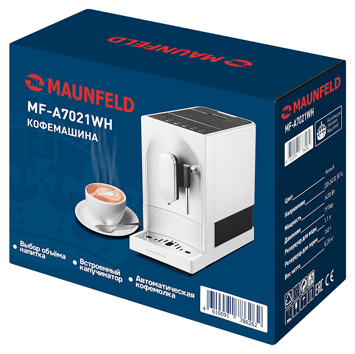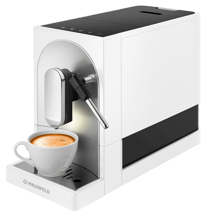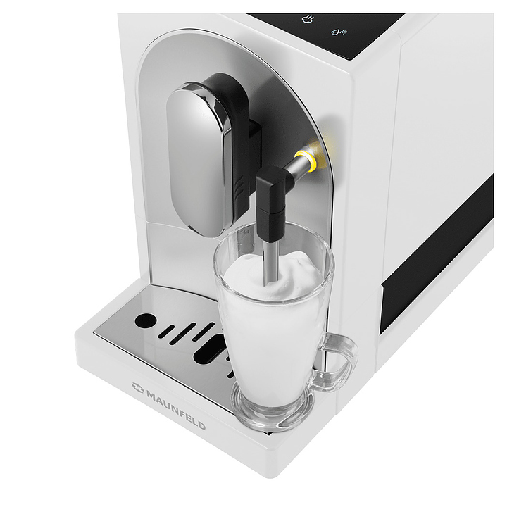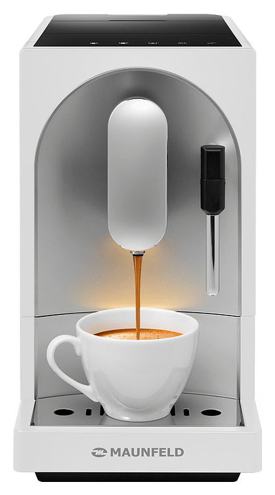 Автоматическая кофемашина Maunfeld MF-A7021WH предназначена для приготовления кофе эспрессо и напитков на его основе в гостиницах, офисах и домашних условиях. Модель оснащена встроенной кофемолкой, капучинатором, кабелем питания с евровилкой и сенсорной панелью управления. Корпусы прибора и диспенсера, основание подставки для чашек и рукоятка трубки капучинатора выполнены из пластика с матовой белой поверхностью, фронтальная панель корпуса – из металла с матовой серебристой поверхностью, трубка капучинатора и поддон для чашек и фронтальная панель диспенсера – из металла с серебристой поверхностью, резервуар для воды – из прозрачного полимера. Комплектация: