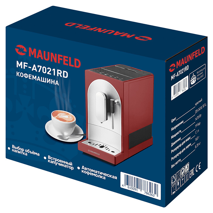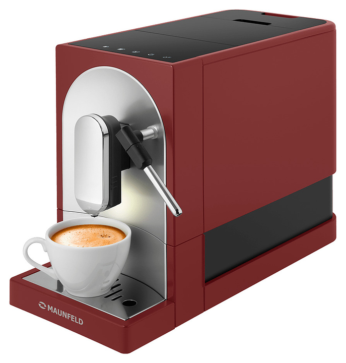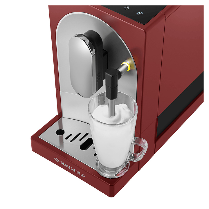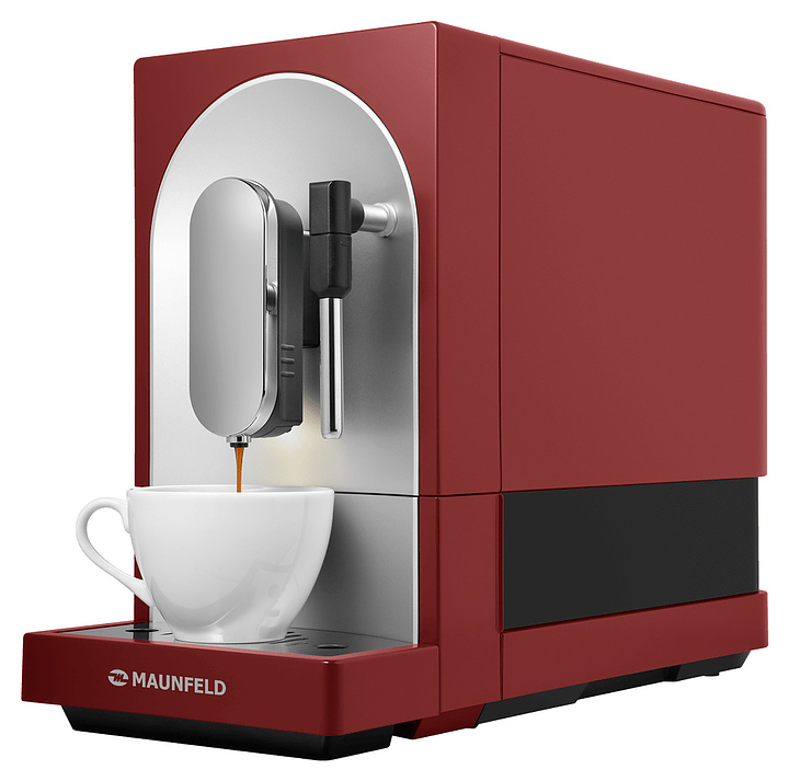 Автоматическая кофемашина Maunfeld MF-A7021RD предназначена для приготовления кофе эспрессо и напитков на его основе в гостиницах, офисах и домашних условиях. Модель оснащена встроенной кофемолкой, капучинатором, кабелем питания с евровилкой и сенсорной панелью управления. Корпусы прибора и диспенсера, основание подставки для чашек и рукоятка трубки капучинатора выполнены из пластика с матовой красной поверхностью, фронтальная панель корпуса – из металла с матовой серебристой поверхностью, трубка капучинатора и поддон для чашек и фронтальная панель диспенсера – из металла с серебристой поверхностью, резервуар для воды – из прозрачного полимера. Комплектация: