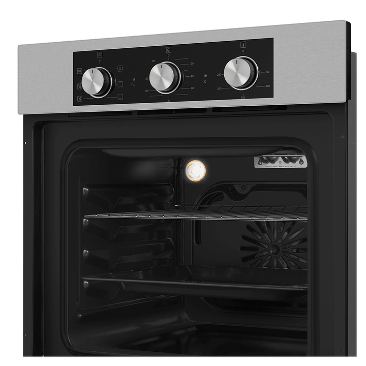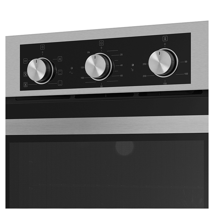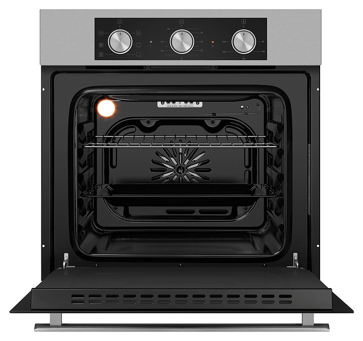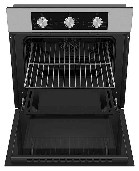 Встраивамый электрический духовой шкаф Maunfeld AEOF6060S предназначен для приготовления большого ассортимента блюд в домашних условиях. Модель оснащена камерой с расположенным в задней стенке вентилятором, верхним и нижним нагревательными элементами, верхним грилем, 5 уровнями интегрированных в боковые стенки направляющих для противней, откидной дверью со смотровым окном, уплощенной горизонтальной рукояткой, кабелем питания без вилки, расположенной в верхней части фронта панелью управления с 3 поворотными цилиндрическими переключателями. Корпус выполнен из высококачественной стали, дверь с покрытием черного цвета и полным остеклением без винтового крепежа прозрачным закаленным стеклом с дымчатой тонировкой, решетка для гриля – из стали с хромированной поверхностью, противень – из стали с эмалированным покрытием, верхняя фронтальная панель и фурнитура – из металла с матовой поверхностью цвета нержавеющей стали. Комплектация: