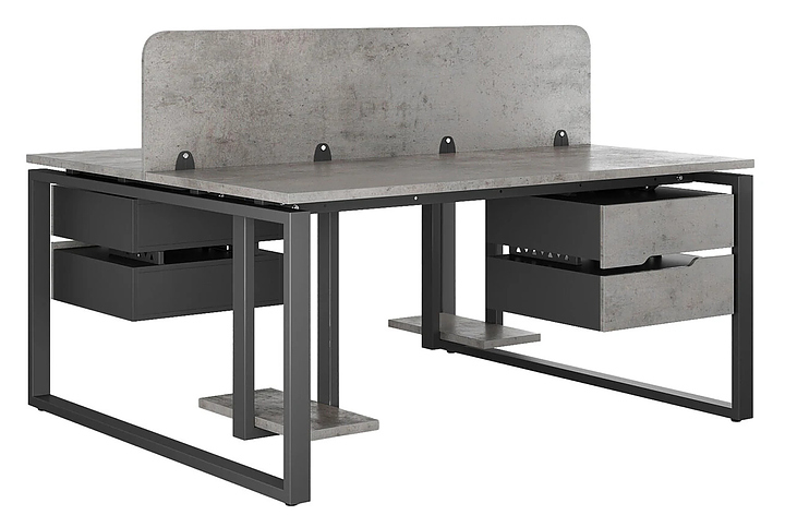 Офисный стол Кобор O1/2-140/140 black/chicago на 2 рабочих места используется в офисных помещениях и кабинетах руководителей. Модель оснащена O-образными опорами. Каркас и опоры выполнены из металла, выкрашенного в цвет черный муар (RAL9005), столешница – из ламинированной древесно-стружечной плиты (ЛДСП) цвета бетон чикаго (F186 ST9). Дополнительные характеристики: