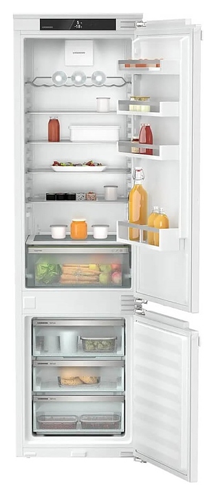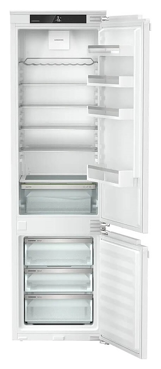 Встраиваемый холодильник Liebherr ICNd 5603 серии Pure предназначен для охлаждения, замораживания, кратковременного и длительного хранения пищевых продуктов и напитков в гостиничных комплексах, офисах, а также домашних условиях. Модель оснащена холодильной камерой сверху и морозильной камерой снизу, правосторонними перенавешиваемыми распашными дверьми, кабелем питания с евровилкой, расположенными за дверью холодильной камеры в верхней части фронта сенсорной панелью управления и монохромным жидкокристаллическим дисплеем с белой подсветкой индикации. Боковины и фасады дверей выполнены из стали, внутренняя облицовка камер – из белого пластика, плоские полки – из прозрачного закаленного стекла, решетчатая полка – из стали с хромированной поверхностью, ящики и навесные полки – из белого пластика с прозрачным фронтом, ящики и полки декорированы металлическими окантовками серебристого оттенка, упаковка – из гофрокартона, полимерной пленки и полистирола.