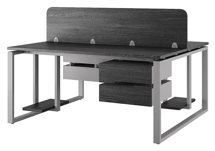 Офисный стол Кобор O1/2-100/160 aluminum/glazed на 2 рабочих места используется в офисных помещениях и кабинетах руководителей. Модель оснащена O-образными опорами. Каркас и опоры выполнены из металла, выкрашенного в цвет алюминиевый металлик (RAL9006), столешница – из ламинированной древесно-стружечной плиты (ЛДСП) цвета черный дуб (H3178 ST37). Дополнительные характеристики: