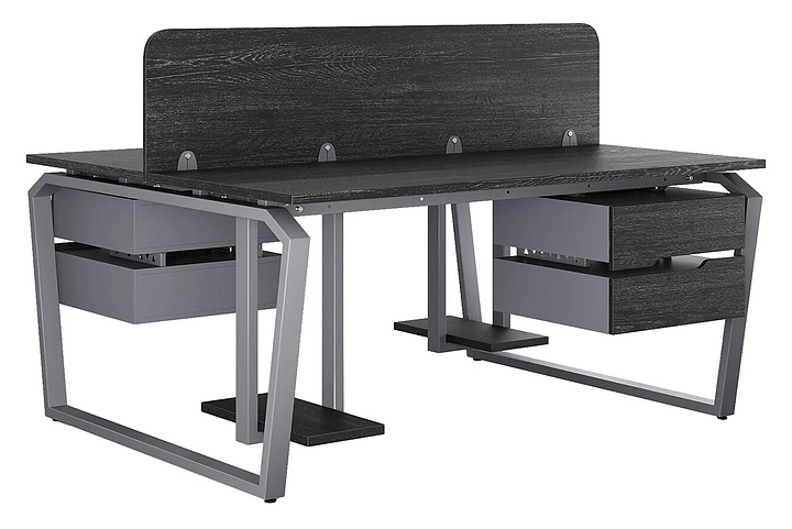 Офисный стол Кобор TB/2-180/140 graphite/glazed на 2 рабочих места используется в офисных помещениях и кабинетах руководителей. Модель оснащена опорами в форме обратной трапеции со скошенными верхними углами. Каркас и опоры выполнены из металла, выкрашенного в цвет графит муар (RAL7024), столешница – из ламинированной древесно-стружечной плиты (ЛДСП) цвета черный дуб (H3178 ST37). Дополнительные характеристики: