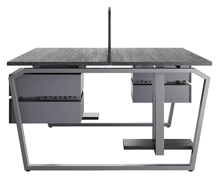 Офисный стол Кобор TB/2-120/160 graphite/glazed на 2 рабочих места используется в офисных помещениях и кабинетах руководителей. Модель оснащена опорами в форме обратной трапеции со скошенными верхними углами. Каркас и опоры выполнены из металла, выкрашенного в цвет графит муар (RAL7024), столешница – из ламинированной древесно-стружечной плиты (ЛДСП) цвета черный дуб (H3178 ST37). Дополнительные характеристики: