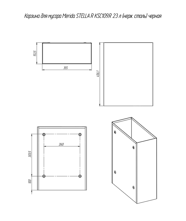 Корзина Merida STELLA R KSC109.R предназначена для сбора и накопления бумажного мусора в санитарных узлах гостиниц, торговых центров, офисов, на предприятиях общественного питания и торговли. Модель оснащена планкой-держателем для одноразового мусорного мешка. Вертикально ориентированный корпус прямоугольного сечения выполнен из нержавеющей стали с матовым покрытием черного цвета, упаковка – гофрокороб. Основные характеристики: