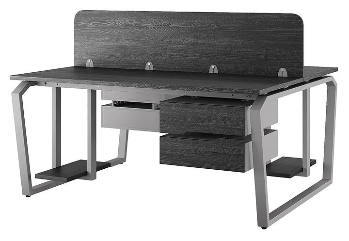 Офисный стол Кобор TB/2-160/120 aluminum/glazed на 2 рабочих места используется в офисных помещениях и кабинетах руководителей. Модель оснащена опорами в форме обратной трапеции со скошенными верхними углами. Каркас и опоры выполнены из металла, выкрашенного в цвет алюминиевый металлик (RAL9006), столешница – из ламинированной древесно-стружечной плиты (ЛДСП) цвета черный дуб (H3178 ST37). Дополнительные характеристики: