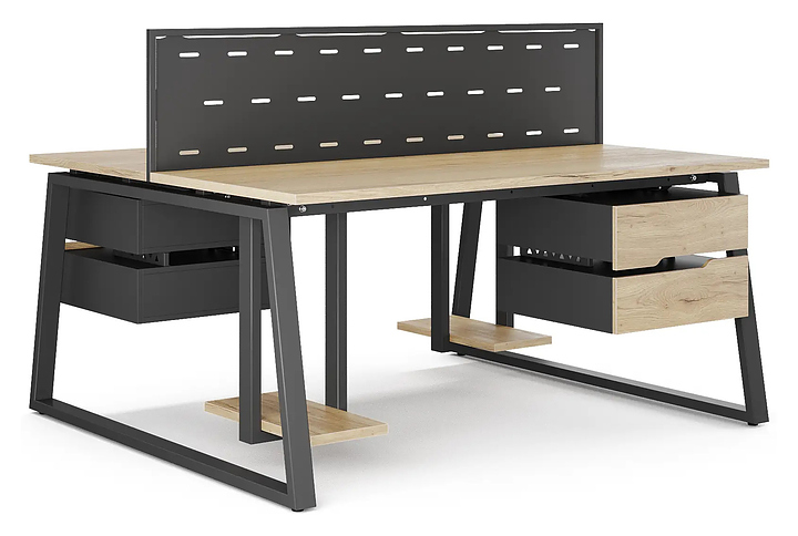 Офисный стол Кобор TR/2-80/120 black/natural на 2 рабочих места используется в офисных помещениях и кабинетах руководителей. Модель оснащена опорами в форме трапеции. Каркас и опоры выполнены из металла, выкрашенного в цвет черный муар (RAL9005), столешница – из ламинированной древесно-стружечной плиты (ЛДСП) цвета натуральный дуб (H1180 ST37). Дополнительные характеристики: