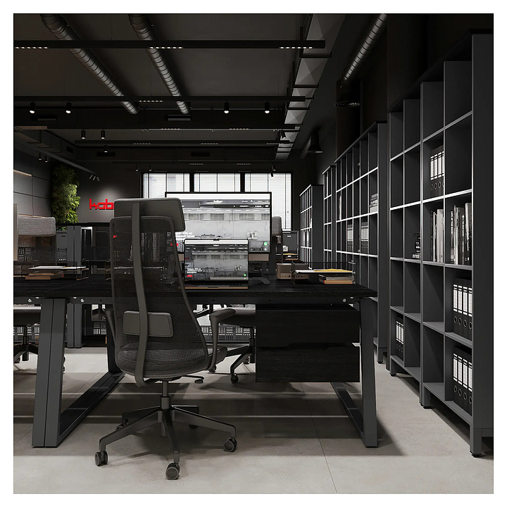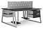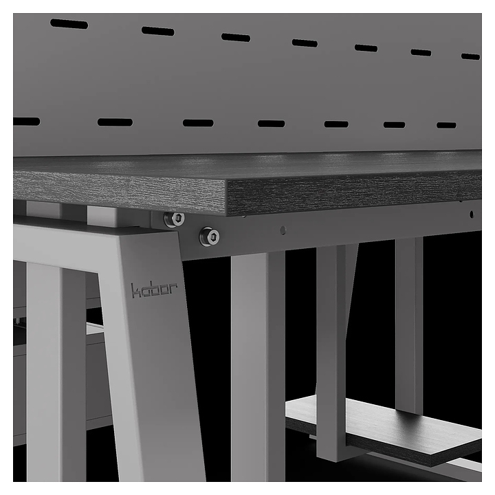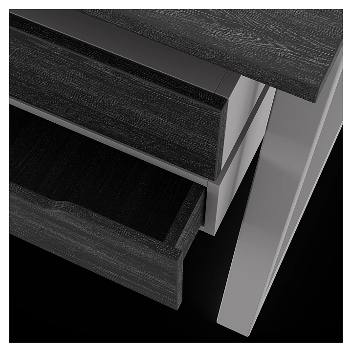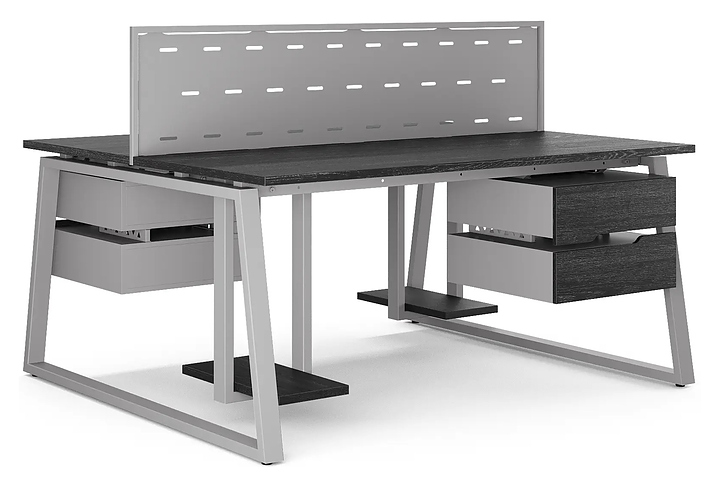 Офисный стол Кобор TR/2-100/120 aluminum/glazed на 2 рабочих места используется в офисных помещениях и кабинетах руководителей. Модель оснащена опорами в форме трапеции. Каркас и опоры выполнены из металла, выкрашенного в цвет алюминиевый металлик (RAL9006), столешница – из ламинированной древесно-стружечной плиты (ЛДСП) цвета черный дуб (H3178 ST37). Дополнительные характеристики: