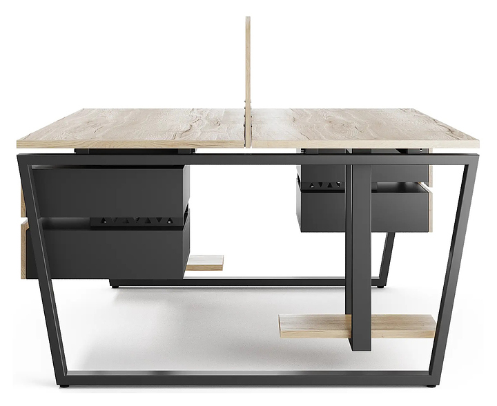 Офисный стол Кобор OTR/2-120/140 black/natural на 2 рабочих места используется в офисных помещениях и кабинетах руководителей. Модель оснащена опорами в форме обратной трапеции. Каркас и опоры выполнены из металла, выкрашенного в цвет черный муар (RAL9005), столешница – из ламинированной древесно-стружечной плиты (ЛДСП) цвета натуральный дуб (H1180 ST37). Дополнительные характеристики: