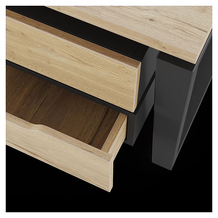 Офисный стол Кобор OTR/2-120/160 black/natural на 2 рабочих места используется в офисных помещениях и кабинетах руководителей. Модель оснащена опорами в форме обратной трапеции. Каркас и опоры выполнены из металла, выкрашенного в цвет черный муар (RAL9005), столешница – из ламинированной древесно-стружечной плиты (ЛДСП) цвета натуральный дуб (H1180 ST37). Дополнительные характеристики: