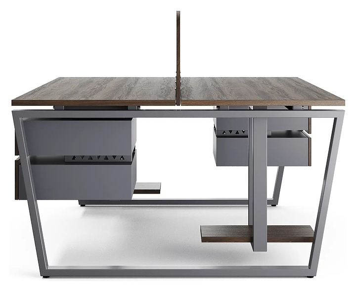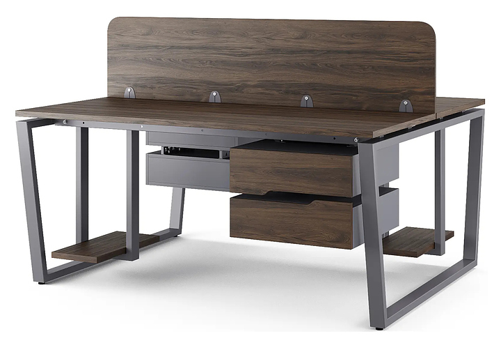 Офисный стол Кобор OTR/2-120/160 graphite/charlston на 2 рабочих места используется в офисных помещениях и кабинетах руководителей. Модель оснащена опорами в форме обратной трапеции. Каркас и опоры выполнены из металла, выкрашенного в цвет графит муар (RAL7024), столешница – из ламинированной древесно-стружечной плиты (ЛДСП) цвета дуб чарльстон (H3154 ST36). Дополнительные характеристики: