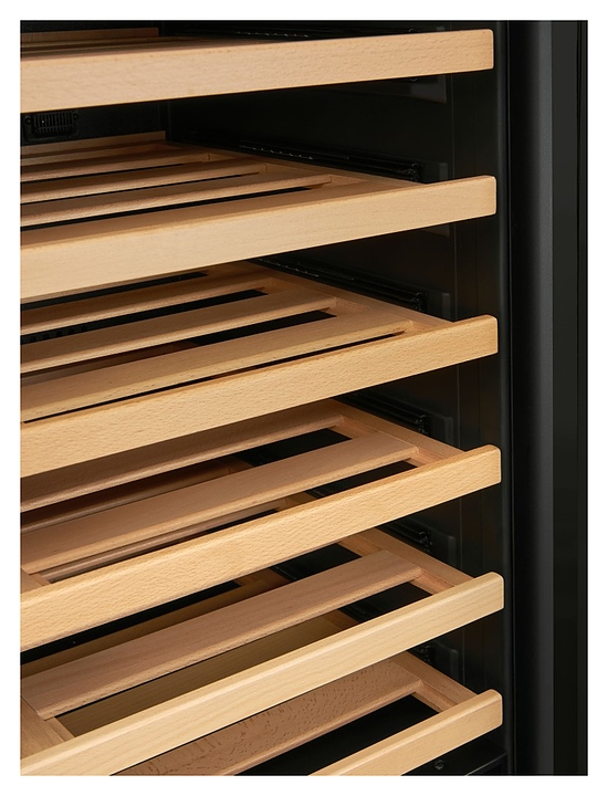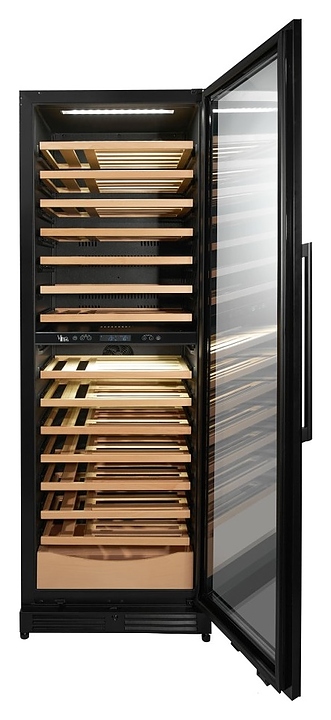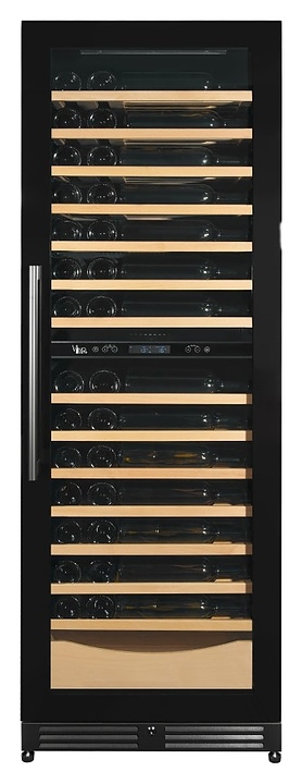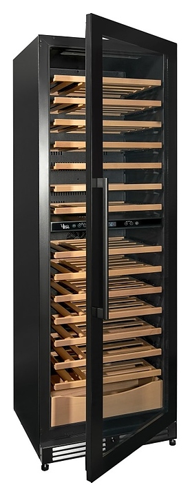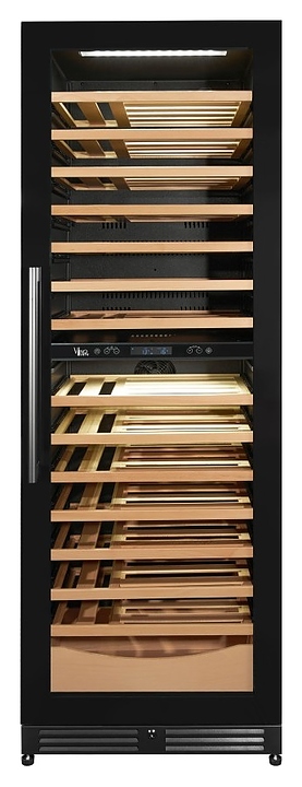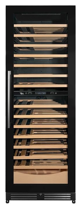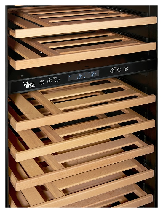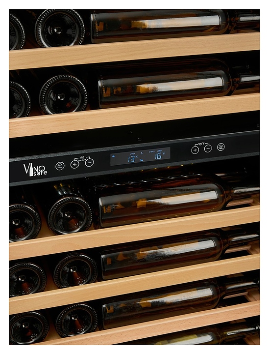 Винный шкаф Vinosafe VSN110BD предназначен для хранения при оптимальных условиях и демонстрации бутилированного вина различных сортов в барах, ресторанах, специализированных магазинах, складских помещениях, а также домашних условиях. Модель оснащена холодильной камерой с 2 независимыми температурными зонами, правосторонней перенавешиваемой распашной дверью на скрытых петлях, вертикальной рукояткой, цокольной воздушной решеткой, обзорным остеклением, кабелем питания с вилкой, расположенной внутри камеры панелью управления с сенсорными клавишами и жидкокристаллическим дисплеем с цифровыми и символьными сегментами индикации. Корпус, рама двери и рукоятка выполнены из металла с антикоррозийным покрытием черного цвета, внутренняя облицовка камеры черного цвета, полки и ящик – из массива древесины светлых пород. В комплект поставки входят 14 съемных полок с направляющими для размещения бутылок, ящик, крепеж для рукоятки, инструкция по эксплуатации, гарантийный талон и заводская упаковка. Особенности: