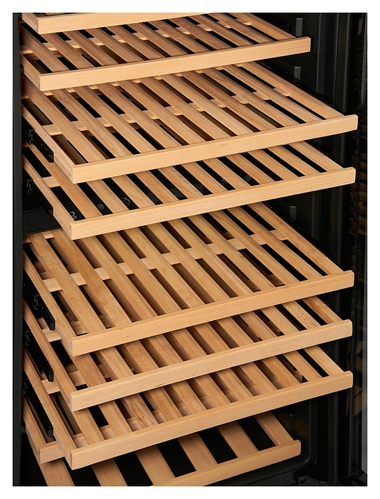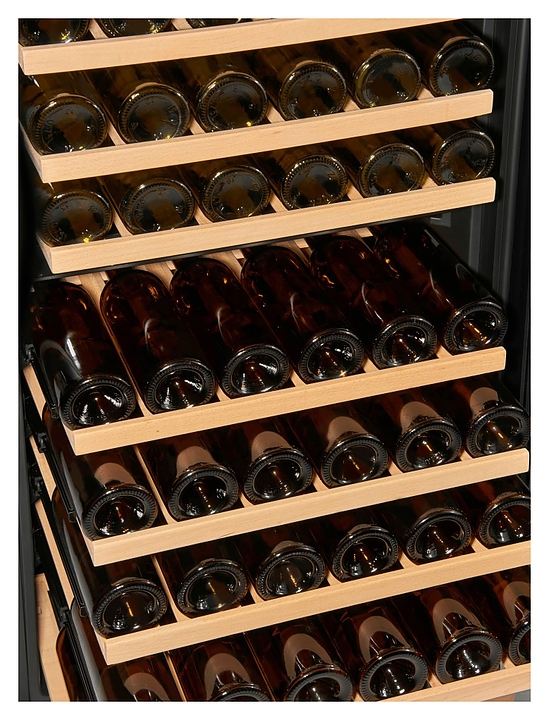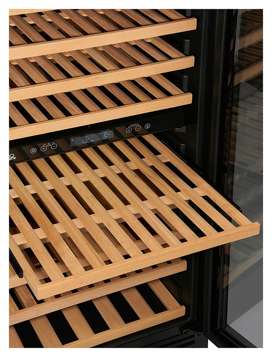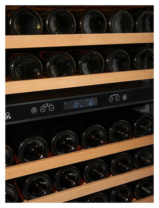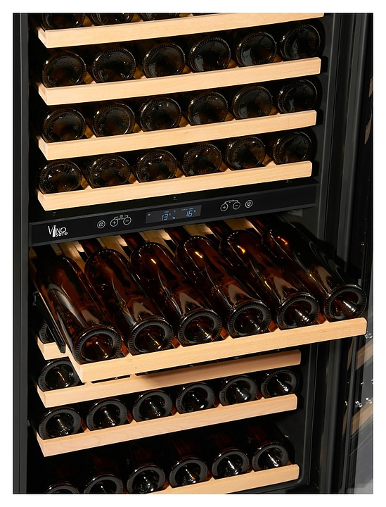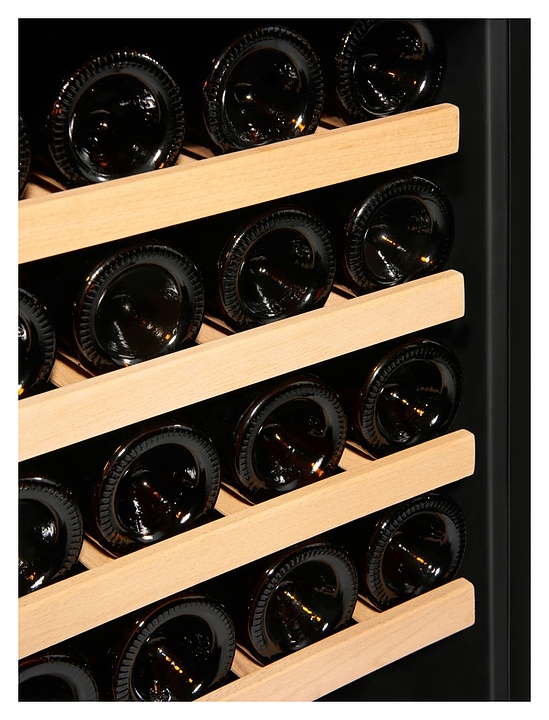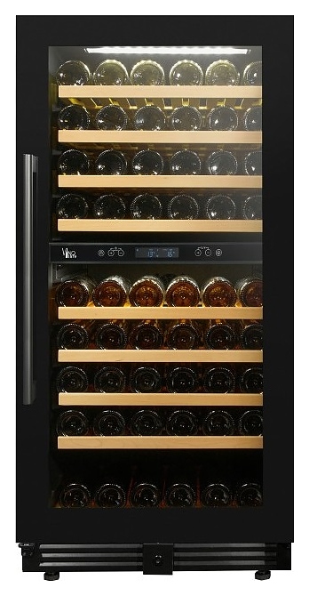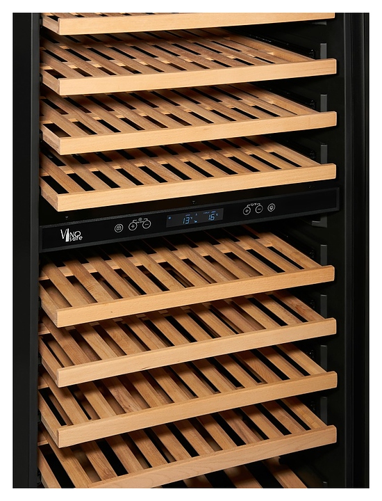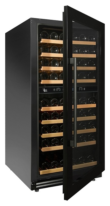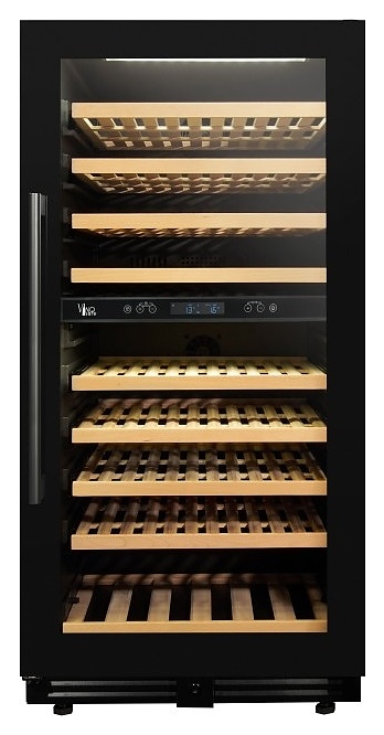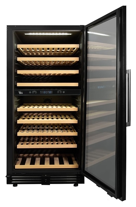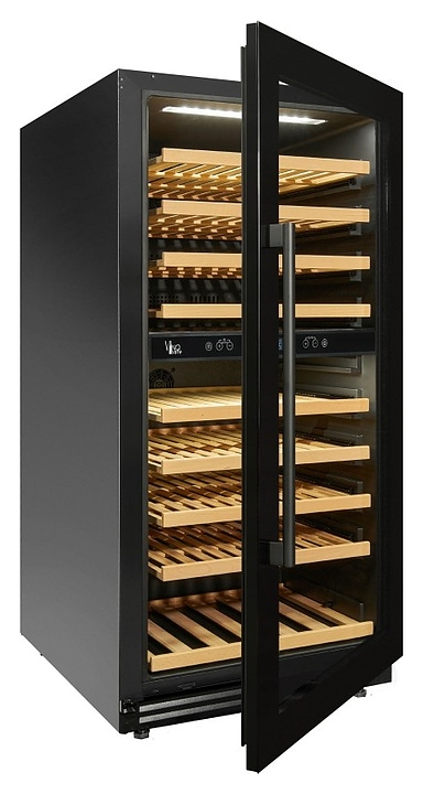Винный шкаф Vinosafe VSN99AD предназначен для хранения при оптимальных условиях и демонстрации бутилированного вина различных сортов в барах, ресторанах, специализированных магазинах, складских помещениях, а также домашних условиях. Модель оснащена холодильной камерой с 2 независимыми температурными зонами, правосторонней перенавешиваемой распашной дверью на скрытых петлях, вертикальной рукояткой, цокольной воздушной решеткой, обзорным остеклением, кабелем питания с вилкой, расположенной внутри камеры панелью управления с сенсорными клавишами и жидкокристаллическим дисплеем с цифровыми и символьными сегментами индикации. Корпус, рама двери и рукоятка выполнены из металла с антикоррозийным покрытием черного цвета, внутренняя облицовка камеры черного цвета, полки – из массива древесины светлых пород. В комплект поставки входят 9 съемных полок с направляющими для размещения бутылок: 8 стандартных и 1 укороченная, крепеж для рукоятки, инструкция по эксплуатации, гарантийный талон и заводская упаковка. Особенности: