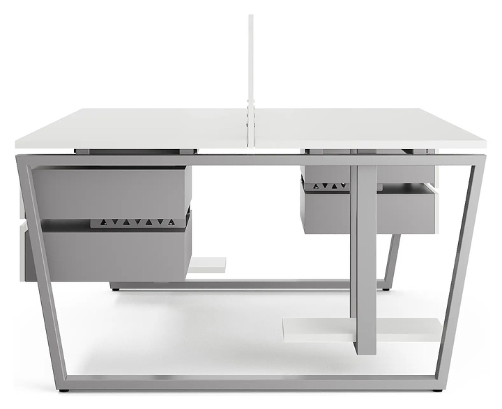Офисный стол Кобор OTR/2-160/140 aluminum/premium на 2 рабочих места используется в офисных помещениях и кабинетах руководителей. Модель оснащена опорами в форме обратной трапеции. Каркас и опоры выполнены из металла, выкрашенного в цвет алюминиевый металлик (RAL9006), столешница – из ламинированной древесно-стружечной плиты (ЛДСП) цвета белый премиум (W1000 ST9). Дополнительные характеристики: