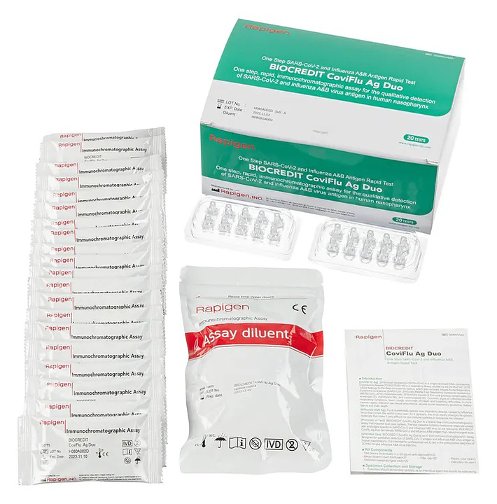Набор экспресс-тестов RapiGEN BIOCREDIT COVIFLU AG DUO используется в специальных лабораториях и больницах, а также в домашних условиях для качественного обнаружения антигена SARS-CoV-2 и антигена вируса гриппа A&B в носоглотке человека. Набор реагентов предназначен для профессионального использования для помощи в предварительной диагностике инфекции COVID-19 и вируса гриппа A&B. В комплект поставки входит :