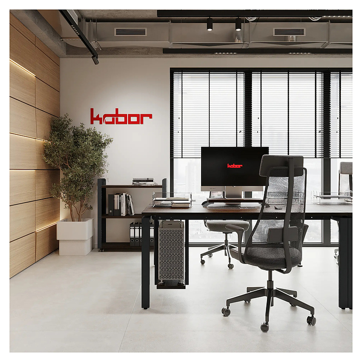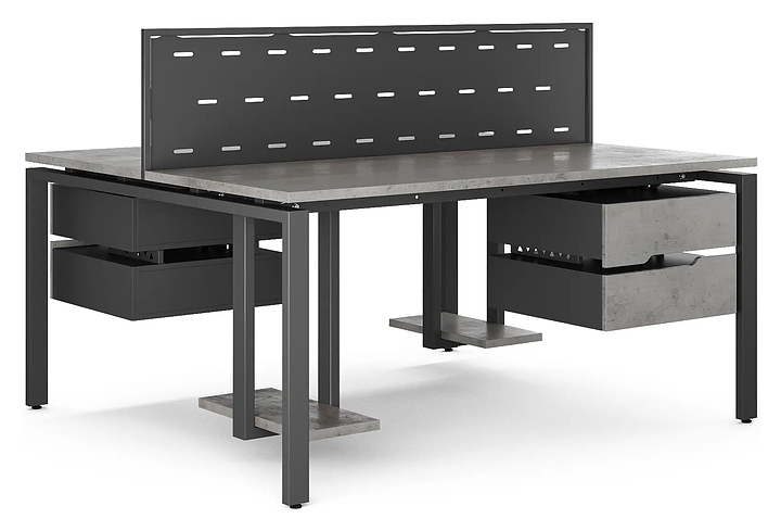 Офисный стол Кобор P/2-100/120 black/chicago на 2 рабочих места используется в офисных помещениях и кабинетах руководителей. Модель оснащена П-образными опорами. Каркас и опоры выполнены из металла, выкрашенного в цвет черный муар (RAL9005), столешница – из ламинированной древесно-стружечной плиты (ЛДСП) цвета бетон чикаго (F186 ST9). Дополнительные характеристики: