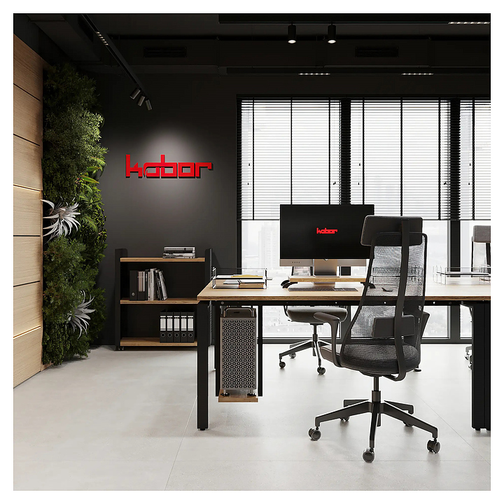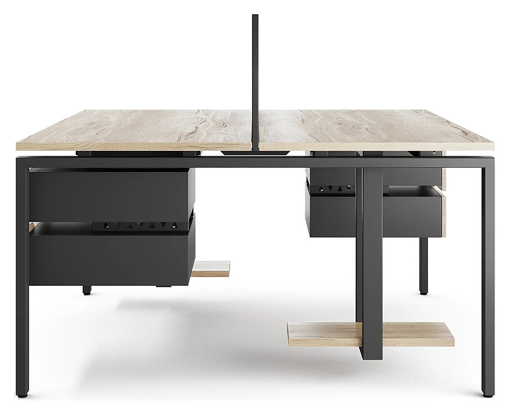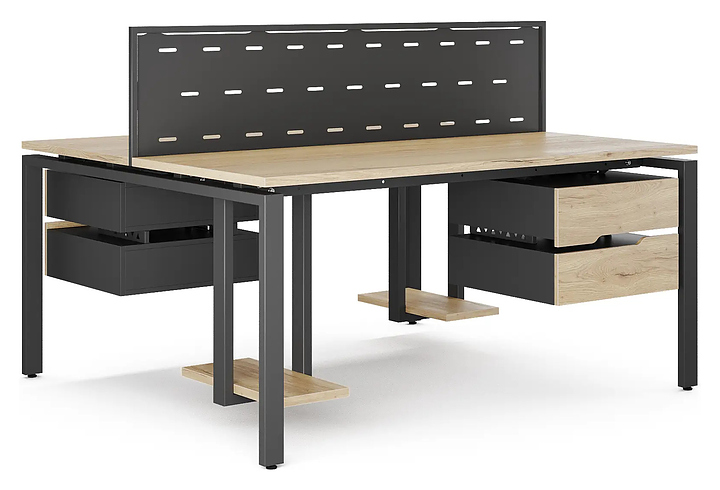 Офисный стол Кобор P/2-120/120 black/natural на 2 рабочих места используется в офисных помещениях и кабинетах руководителей. Модель оснащена П-образными опорами. Каркас и опоры выполнены из металла, выкрашенного в цвет черный муар (RAL9005), столешница – из ламинированной древесно-стружечной плиты (ЛДСП) цвета натуральный дуб (H1180 ST37). Дополнительные характеристики:
