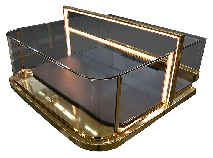 Встраиваемая холодильная витрина Finist Glassier Luxury Gold Slide GLGs-10/7/3 используется для кратковременного хранения и эффектной предпродажной демонстрации кондитерских изделий и других гастрономических товаров на предприятиях общественного питания и торговли. Модель прямоугольно ориентированной формы оснащена подставкой с втроенным холодильным агрегатом и верхним остеклением. Столешница выполнена из нержавеющей стали с черным покрытием муар, купол – из моллированного стекла, декоративные элементы покрыты золотистым напылением из нитрида титана. Особенности:
