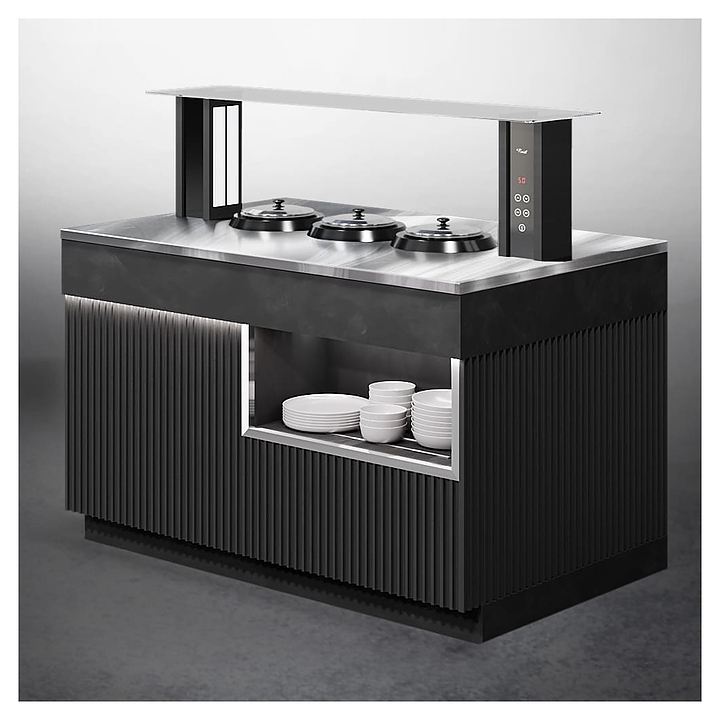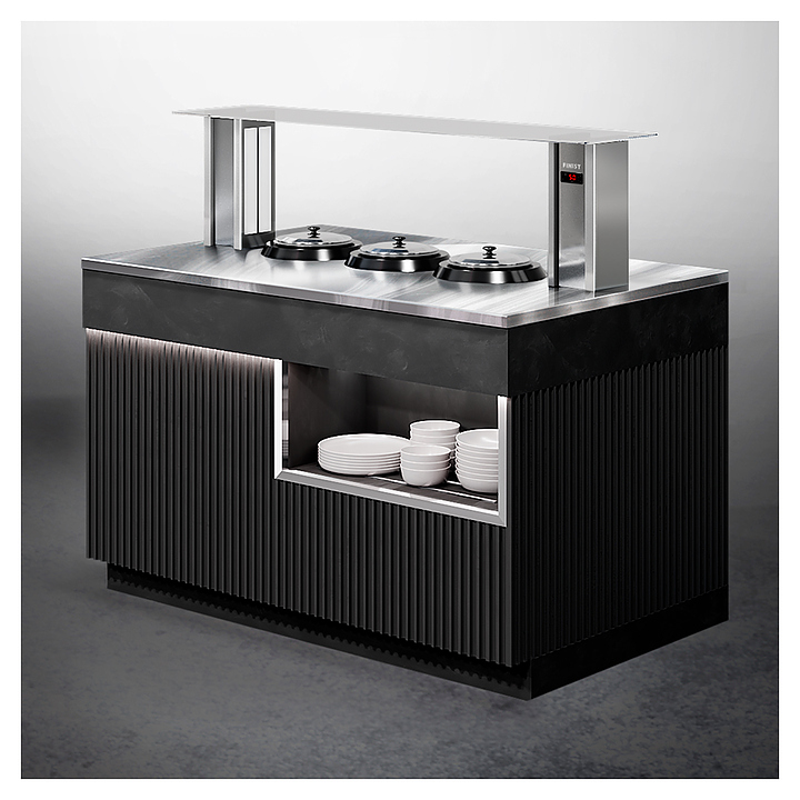 Шведский стол Finist ШСс2150 используется в гостиницах, на предприятиях общественного питания и торговли для кратковременного хранения в гоячем состоянии и раздачи путем самообслуживания первых блюд. Модель оснащена подставкой, столешницей с 4 электросупницами и панелью управления. Столешница выполнена из высококачественной нержавеющей стали, облицовочные панели корпуса – из МДФ с покрытием дизайна «Сидней» черного цвета, верхняя полка – из просветленного стекла. Посуда не входит в комплект поставки и приобретаются отдельно. Особенности: