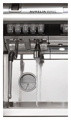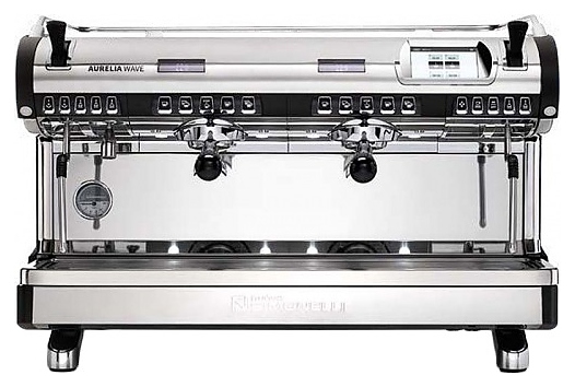 Автоматическая кофемашина Nuova Simonelli Nuova Aurelia Wave T3 2Gr 380V используется в кофейнях, барах, ресторанах и на других предприятиях общественного питания и торговли для приготовления эспрессо и различных кофейных напитков на его основе. Модель оснащена 2 высокими рожковыми кофейными группами, 2 трубками подачи пара, соплом подачи горячей воды легкой очистки, основной панелью управления с многофункциональным сенсорным дисплеем, а также персональными панелями для каждой группы с нажимными клавишами, цифровыми дисплеями и светодиодными индикаторами. Облицовочные панели корпуса, сопла и трубки подачи выполнены из высококачественной нержавеющей стали, паровой бойлер – из меди, декоративные С-образные вставки на боковых панелях корпуса – из ударопрочного АБС-пластика черного цвета.