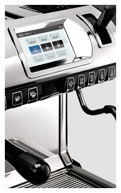 Индикация активных режимов и функций, текущих даты и времени, температуры напитка и состояния процесса в каждой группе, давления в бойлере и на выходе и других параметров
