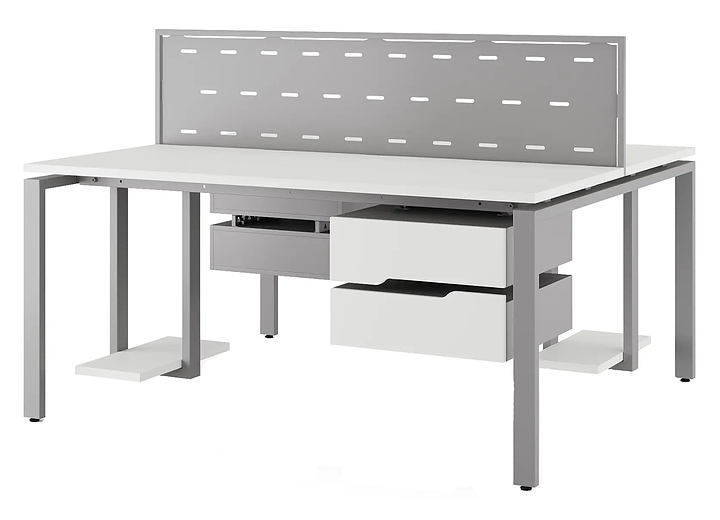 Офисный стол Кобор P/2-80/160 aluminum/premium на 2 рабочих места используется в офисных помещениях и кабинетах руководителей. Модель оснащена П-образными опорами. Каркас и опоры выполнены из металла, выкрашенного в цвет алюминиевый металлик (RAL9006), столешница – из ламинированной древесно-стружечной плиты (ЛДСП) цвета белый премиум (W1000 ST9). Дополнительные характеристики: