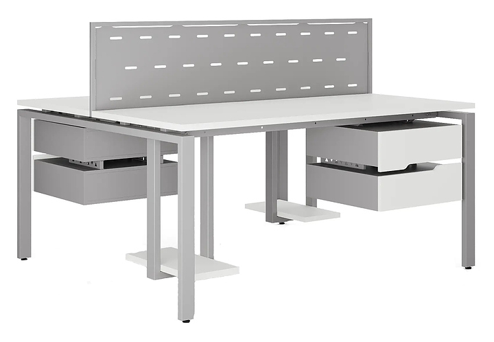 Офисный стол Кобор P/2-160/160 aluminum/premium на 2 рабочих места используется в офисных помещениях и кабинетах руководителей. Модель оснащена П-образными опорами. Каркас и опоры выполнены из металла, выкрашенного в цвет алюминиевый металлик (RAL9006), столешница – из ламинированной древесно-стружечной плиты (ЛДСП) цвета белый премиум (W1000 ST9). Дополнительные характеристики: