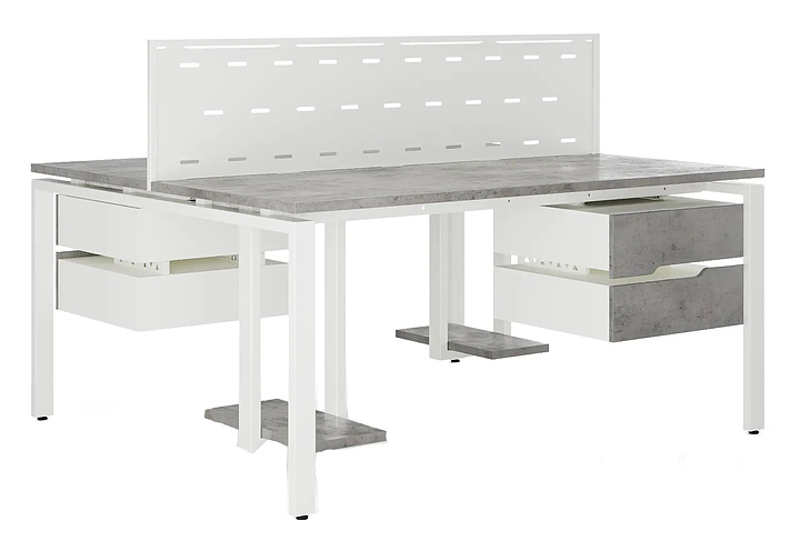 Офисный стол Кобор P/2-140/160 white/chicago используется в офисных помещениях и кабинетах руководителей. Модель оснащена П-образными опорами. Каркас выполнен из металла, выкрашенного в цвет белый муар (RAL9016), столешница – из ламинированной древесно-стружечной плиты (ЛДСП) цвета бетон чикаго (F186 ST9). Дополнительные характеристики: