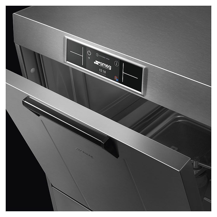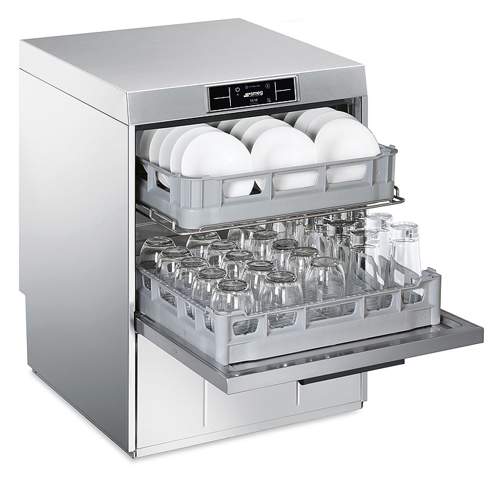 Посудомоечная машина с фронтальной загрузкой Smeg SPD522S серии PURA используется на предприятиях общественного питания и торговли для мойки столовых приборов, тарелок, стаканов, чашек в кассетах, а также гастроемкостей и другой посуды. Модель оснащена электронной панелью управления с TFT-дисплеем, дверцей с двойными стенками и уплотнителем с 3 сторон и регулируемыми по высоте ножками. Бак выполнен из нержавеющей стали AISI 304, фильтр, моющие и ополаскивающие рукава - из нержавеющей стали. Комплектация: