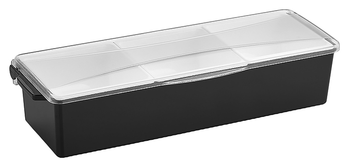 Контейнер Gastroplast GSE-03 используется для хранения фруктов, орехов, специй и соусов на предприятиях общественного питания и торговли. Модель оснащена карманом с 3 съемными емкостями и прозрачной крышкой. Корпус выполнен из черного полипропилена (PP), емкости – из белого полипропилена (PP) без содержания токсичного бисфенола A (BPA), крышка – из прозрачного поликарбоната (PC). Особенности: