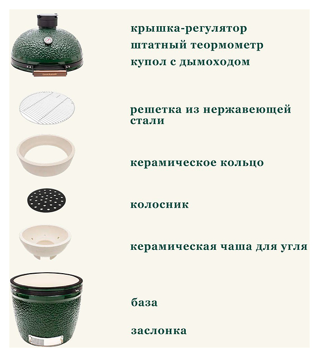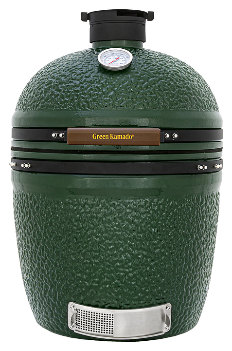 Керамический гриль Green Kamado L предназначен для приготовления блюд на древесном угле в частных домах и на предприятиях общественного питания. Модель сочетает в себе несколько видов оборудования для высокотемпературного приготовления пищи: гриль, коптильня и мини-печь для пиццы в одном устройстве. Керамический корпус покрыт специальной глазурью, защищающей от выцветания на солнце и воздействия атмосферных осадков. Комплектация: