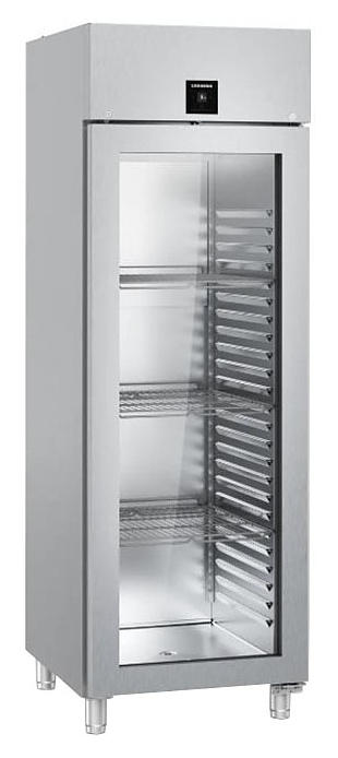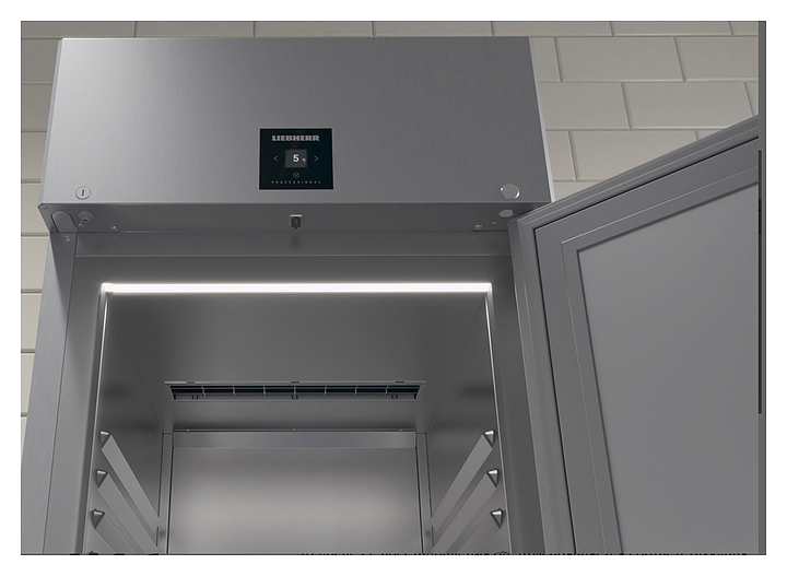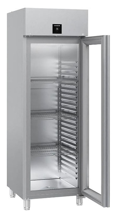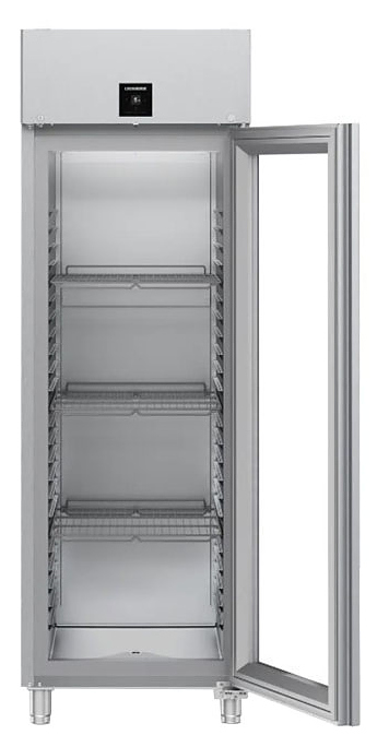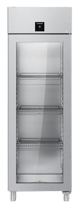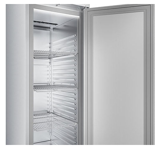 Холодильный шкаф Liebherr FRPSvg 6511 предназначен для охлаждения и кратковременного хранения скоропортящихся продуктов и напитков на предприятиях общественного питания и торговли. Модель оснащена гигиеничной цельной камерой из хромоникелевой стали с 3 переставляемыми по высоте решетчатыми полками, электронным управлением и цифровой индикацией температуры. Внутренняя обшивка выполнена из хромоникелевой стали 1.4301/AISI 304, корпус, рамка дверцы и ножки - из хромоникелевой стали, стекло дверцы обрамлено нержавеющей сталью, покрытие решеток - из пластика, ручка - из алюминия. Особенности: