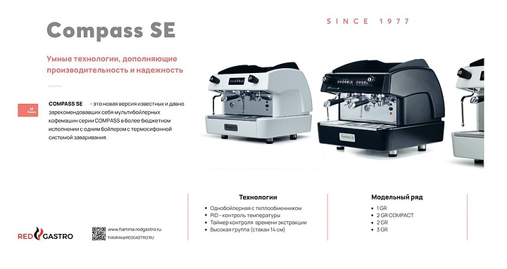 Автоматическая рожковая кофемашина FIAMMA Compass 2 SЕ TС Black используется на предприятиях общественного питания и торговли для приготовления эспрессо и кофейных напитков на его основе. Модель оснащена одним бойлером и термосифонной системой. Особенности: