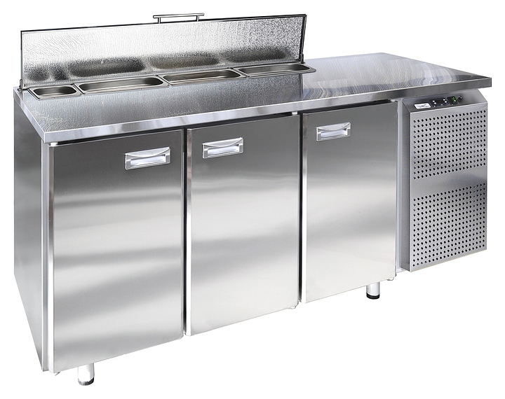 Холодильный стол Finist СХСс-700-3 предназначен для сохранения свежести ингредиентов для холодных закусок и салатов на предприятиях общественного питания и торговли. Модель оснащена расположенным сбоку агрегатным отсеком, столешницей с задним бортом и отсеком под гастроемкости с крышкой, 3 холодильными камерами с распашными дверцами, устойчивыми ножками с подпятниками, кабелем питания с евровилкой и кнопочной панелью управления с цифровым дисплеем. Цельнозаливной корпус выполнен из высококачественной нержавеющей стали. Особенности: