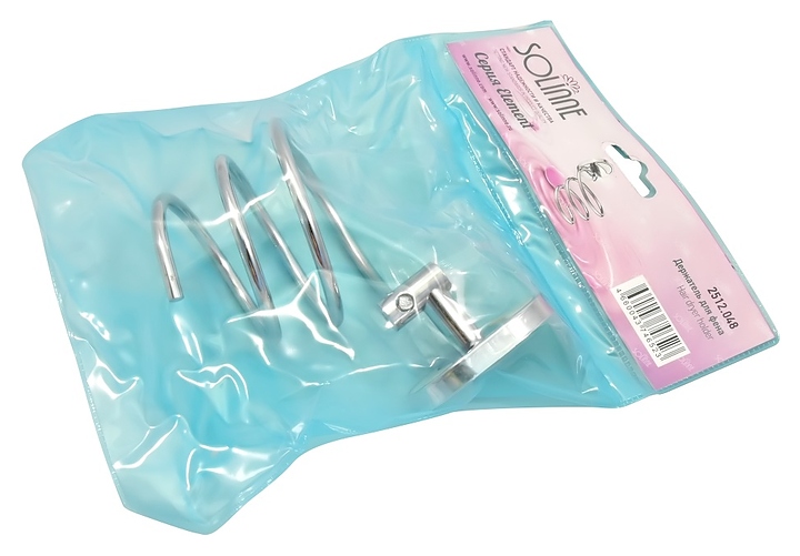 Держатель Puff Solinne 2512.048 Element используется для размещения фена в ванной комнате. Коллекция Element отличается простотой и функциональностью. Модель в виде изогнутого в форме нисходящей спирали прутка оснащена креплением овальной формы. Изделие выполнено из металла с глянцевым покрытием оттенка хром, декоративные заглушки – из пластика, упаковка – мягкий полимерный блистер. Комплектация: