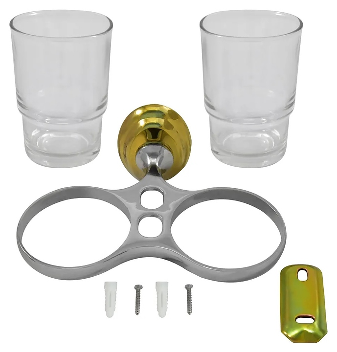 Подстаканник Puff Solinne 3168CG Хром+ используется для компактного размещения зубных щеток, бритвенных станков и аналогичных принадлежностей в ванной комнате. Модель состоит из двойного кольцеобразного держателя с декорированным ступенчатым рельефом креплением овальной формы и 2 съемных стаканов круглого сечения. Держатель выполнен из металла с глянцевым покрытием оттенка хром, крепление с глянцевой поверхностью золотистого оттенка, стаканы – из прозрачного стекла, упаковка – картонная коробка. Комплектация: