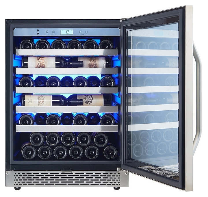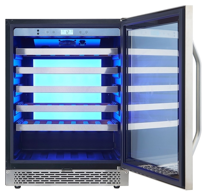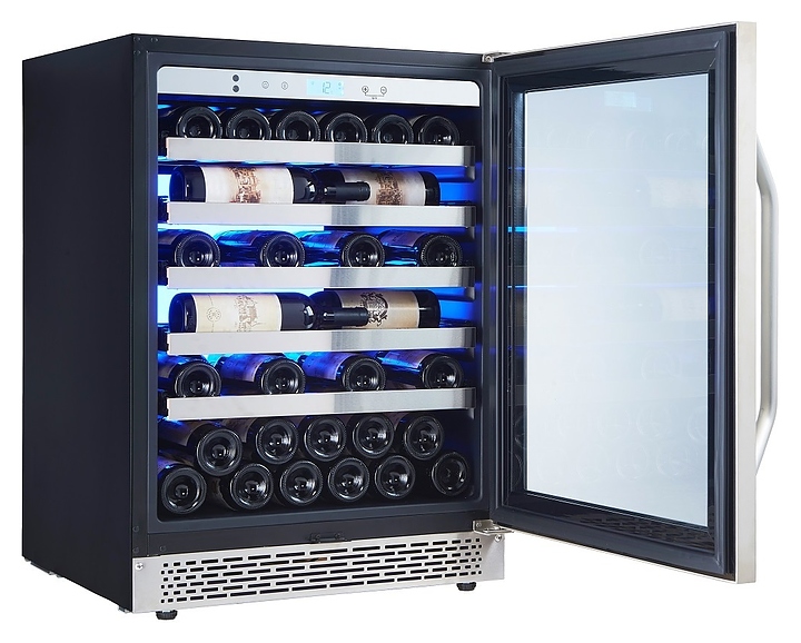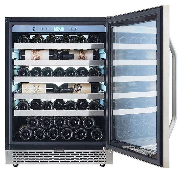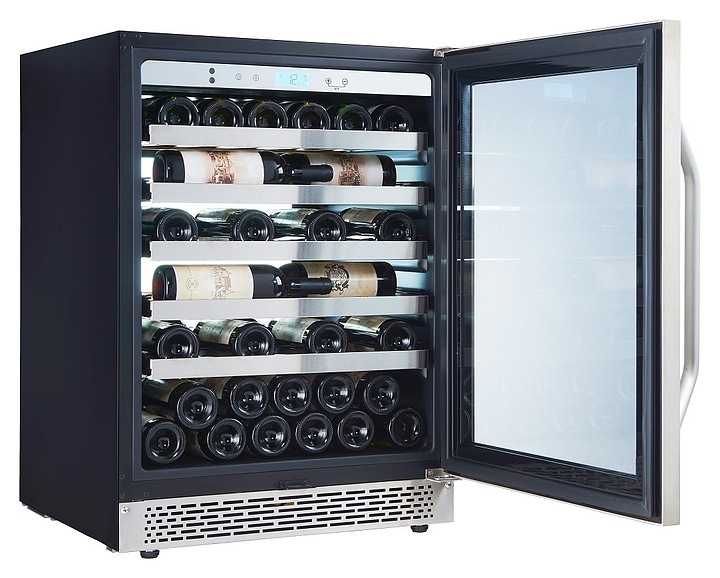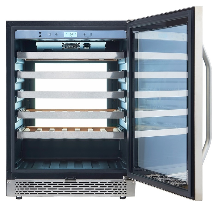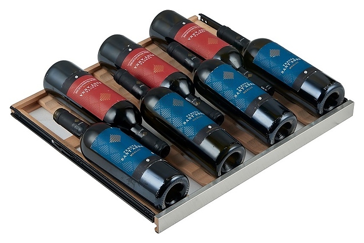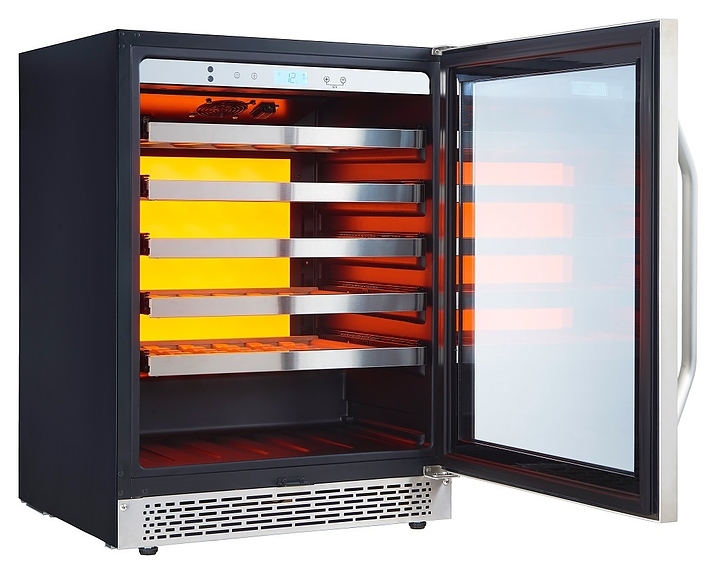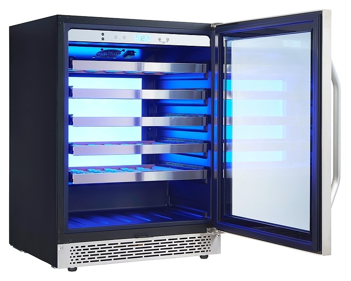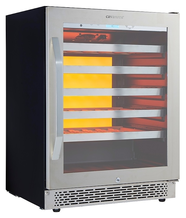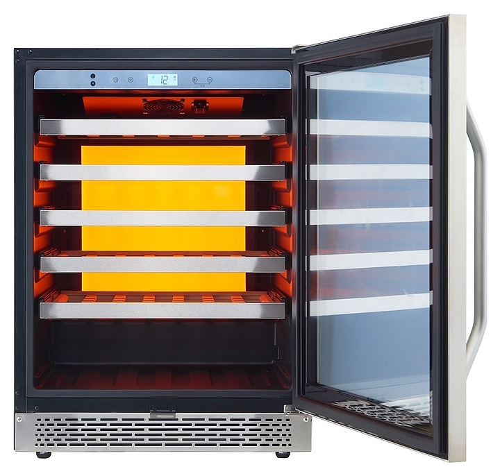 Винный шкаф Cavanova CV045-1TL предназначен для хранения при оптимальных условиях и демонстрации бутилированного вина различных сортов в барах, ресторанах, специализированных магазинах, подсобных складских помещениях, а также в домашних условиях. Модель оснащена монотемпературной холодильной камерой, правосторонней распашной дверью с длинной вертикальной рукояткой, прозрачным обзорным остеклением, цокольной решеткой и расположенной за дверью в верхней части фронта сенсорной панелью управления с жидкокристаллическим дисплеем индикации. Корпус выполнен из металла с антикоррозийным покрытием черного цвета, фронт рамы двери и рукоятка с поверхностью серебристого оттенка, полки – из массива древесины. В комплект поставки входят 5 полок с направляющими для размещения бутылок, комплект ключей к замку, инструкция по эксплуатации и гарантийный талон. Особенности: