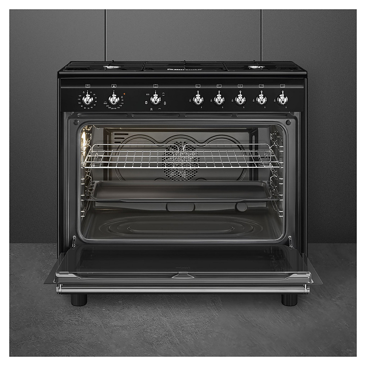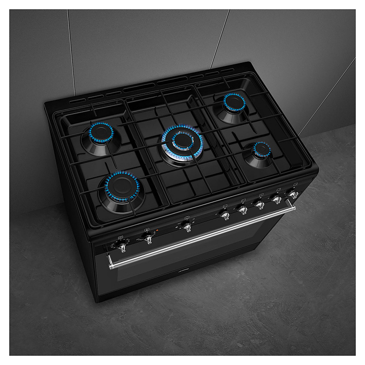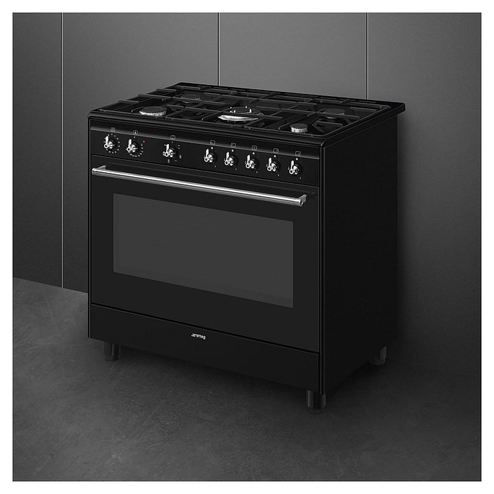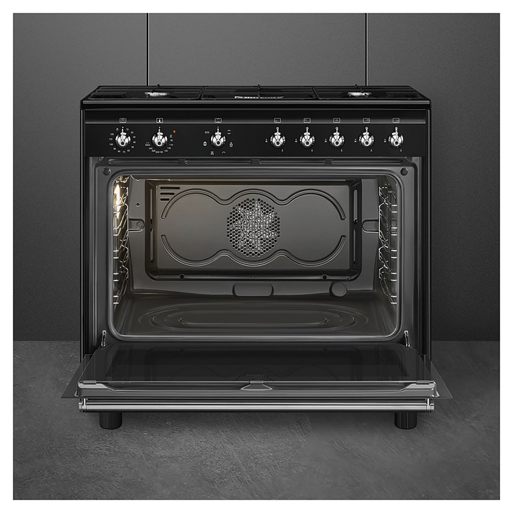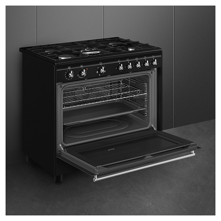 Комбинированный варочный центр SMEG CX91GMBL серии Concerto предназначен для приготовления большого ассортимента блюд в гостиничном и ресторанном бизнесе, на предприятих пищевой промышленности, общественного питания и в домашних условиях. Модель оснащена газовой варочной поверхностью, задним бортом, многофункциональным электрическим духовым шкафом с 2 съемными стойками с 5 уровнями направляющих для противней, откидной дверью со смотровым окном, длинной трубчатой горизонтальной рукояткой и панелью управления с 8 поворотными переключателями. Корпус, варочная поверхность и опоры выполнены из высококачественной стали с глянцевым антикоррозийным покрытием эмалью черного цвета, дверь с полным фронтальным остеклением без винтового крепежа тонированным стеклом, газовые решетки и крышки конфорок – из металла с матовым эмалированным покрытием черного цвета, фурнитура – из нержавеющей стали с сатинированной серебристой поверхностью.