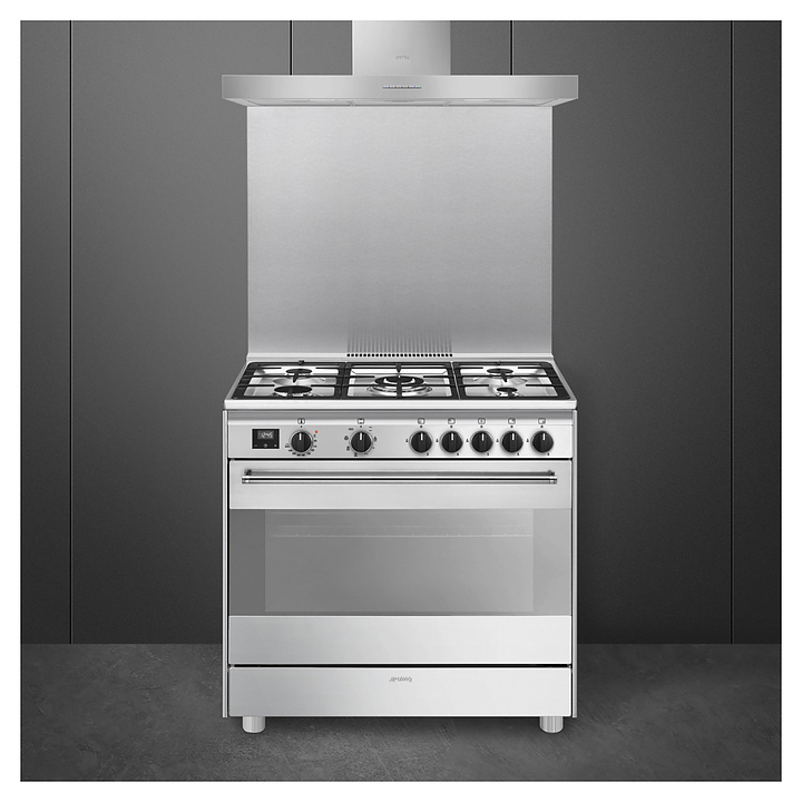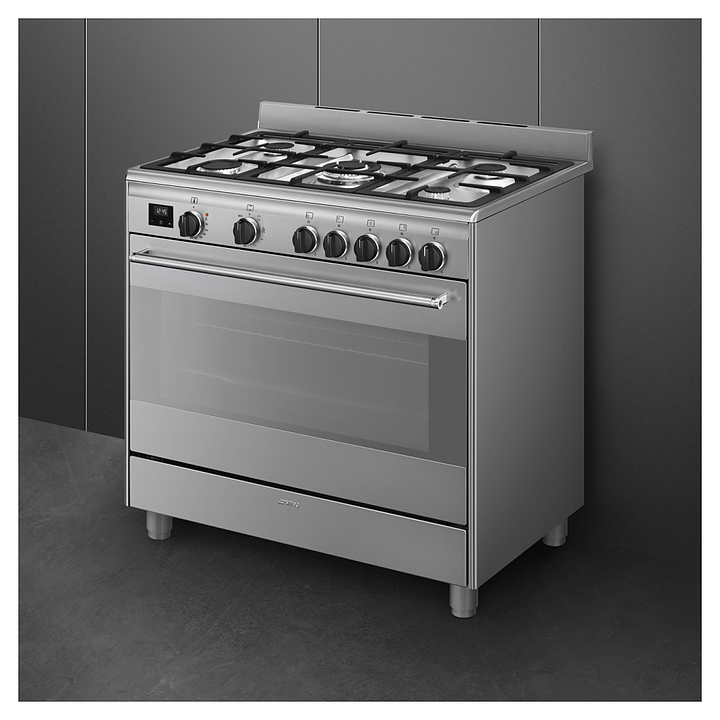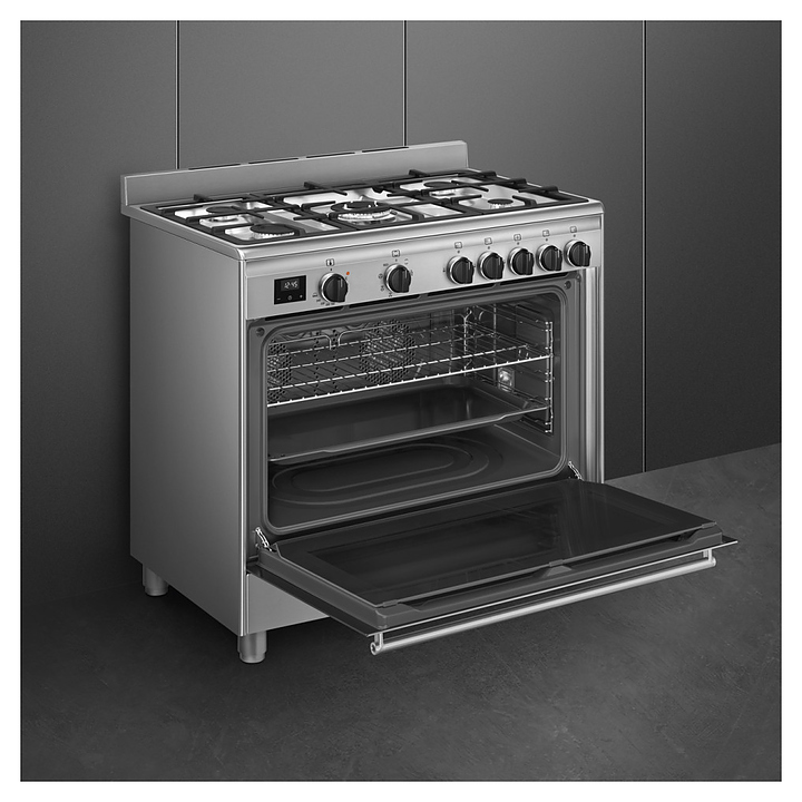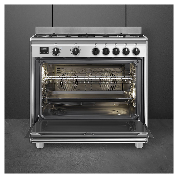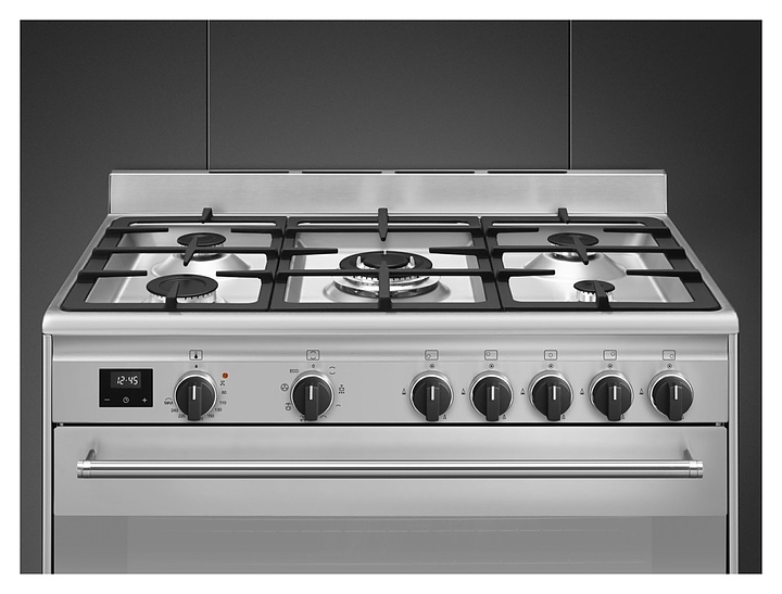 Комбинированный варочный центр SMEG BG91X2 серии Concerto предназначен для приготовления большого ассортимента блюд в гостиничном и ресторанном бизнесе, на предприятих пищевой промышленности, общественного питания и в домашних условиях. Модель оснащена газовой варочной поверхностью, задним бортом, многофункциональным электрическим духовым шкафом с 2 съемными стойками с 5 уровнями направляющих для противней, откидной дверью со смотровым окном, длинной трубчатой горизонтальной рукояткой и панелью управления с 7 поворотными переключателями, сенсорными функциональными клавишами и светодиодным цифровым дисплеем (DigiScreen) cс белой подсветкой индикации. Корпус, варочная поверхность и рукоятка выполнены из высококачественной нержавеющей стали с сатинированной серебристой поверхностью, дверь с частичным фронтальным остеклением без винтового крепежа матовым стеклом Stopsol, газовые решетки – из чугуна, крышки конфорок – из металла с матовым эмалированным покрытием черного цвета, переключатели с дизайном Master Black черного цвета.