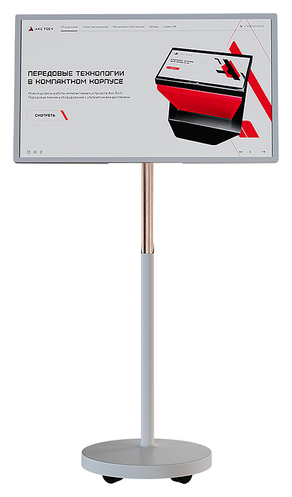 Интерактивная панель AxeTech Slim 27" используется для проведения уроков в школах, лекций в образовательных учреждениях, конференций, бизнес-совещаний, а также для отображения информации в выставочных комплексах и музеях. Модель отличается минималистичным дизайном и тонким дисплеем, который можно расположить горизонтально и вертикально, что позволяют вписать устройство в любое пространство. Встроенные колесики гарантируют легкое перемещение. Корпус выполнен из стали. В комплект поставки входит провод питания. Особенности: