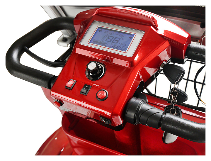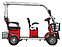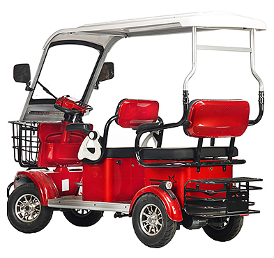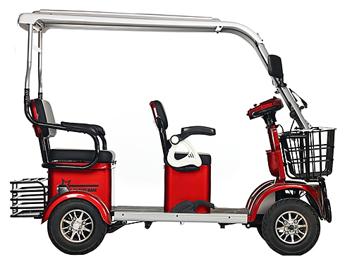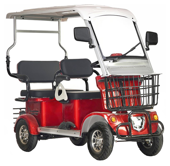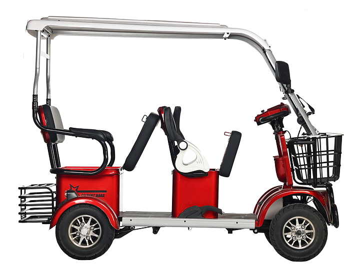 Трицикл Rutrike Gelbert Hara используется для комфортного передвижения по городу, загородным территориям и курортам. Модель оснащена крышей для защиты от солнца и непогоды, 2 рядами сидений, корзинами спереди и сзади для дополнительных грузов и багажником под задним сиденьем. Корзины выполнены из металла. Аккумуляторные батареи и зарядное устройство в комплект поставки не входят. Особенности: