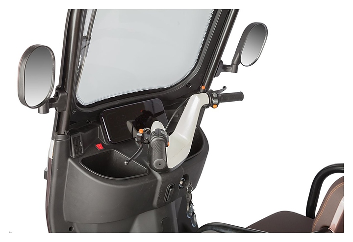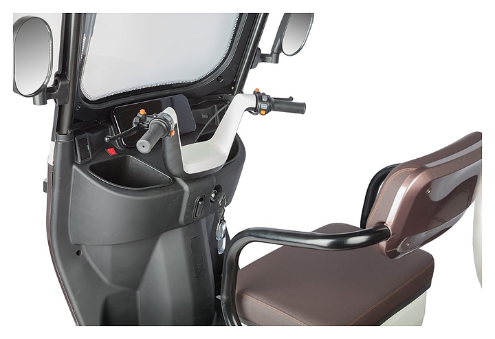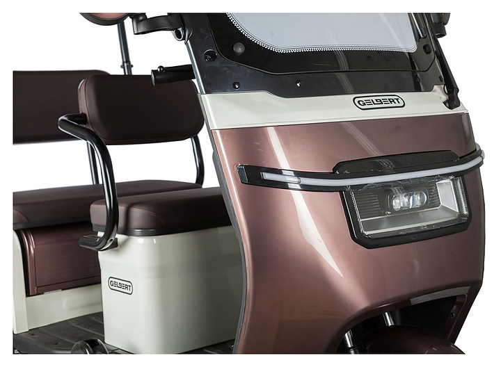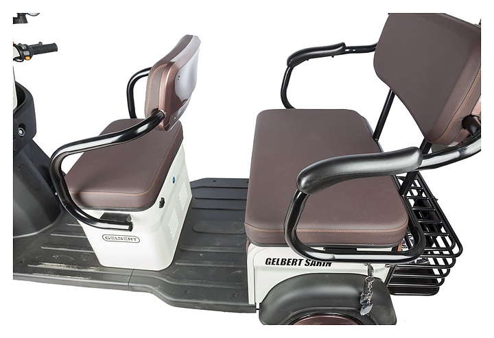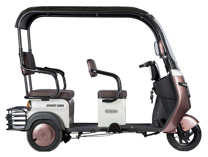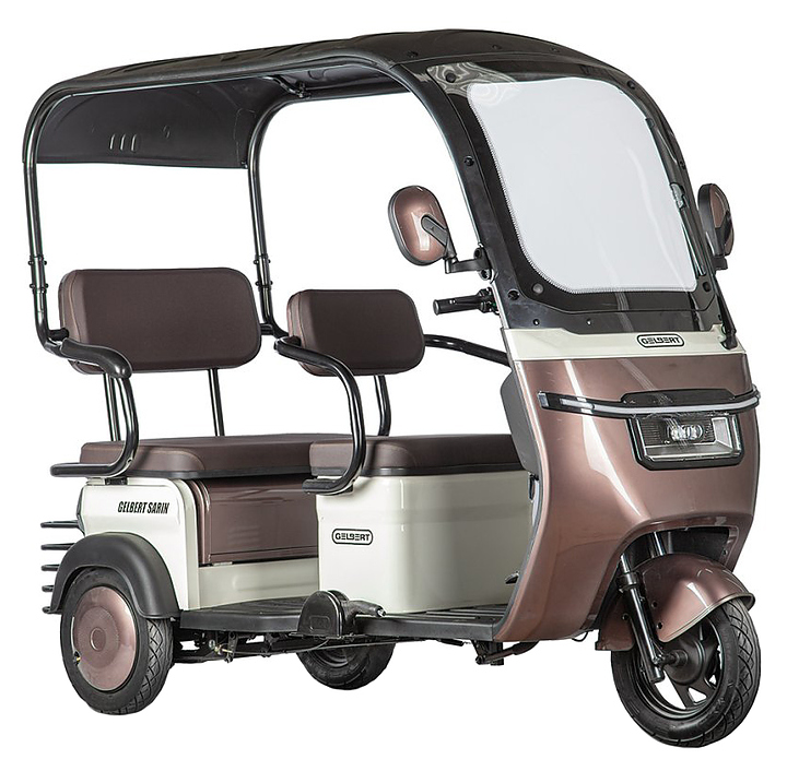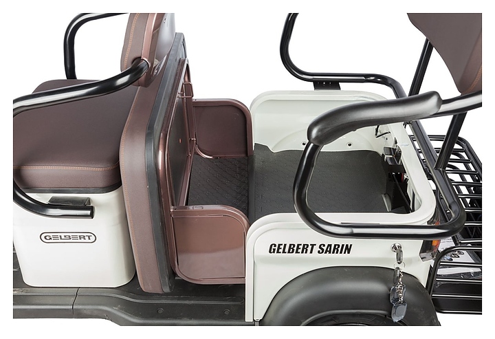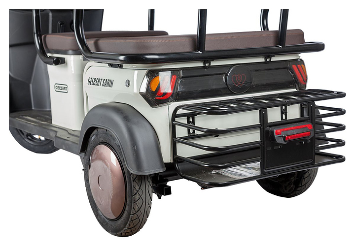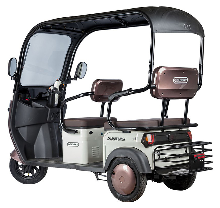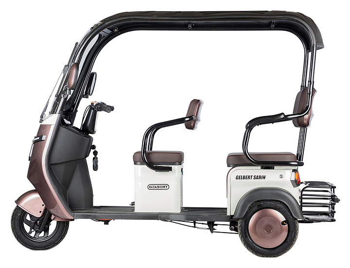 Трицикл Rutrike Gelbert Sarin используется для комфортного передвижения по городу, загородным территориям и курортам. Модель оснащена крышей для защиты от солнца и непогоды, 2 рядами сидений с подлокотниками и спинками, корзиной сзади, задним приводом и барабанными передними и задними тормозами. Широкие колеса гарантируют устойчивость и плавность хода даже на неровных поверхностях. Аккумуляторные батареи и зарядное устройство в комплект поставки не входят. Дополнительные характеристики: