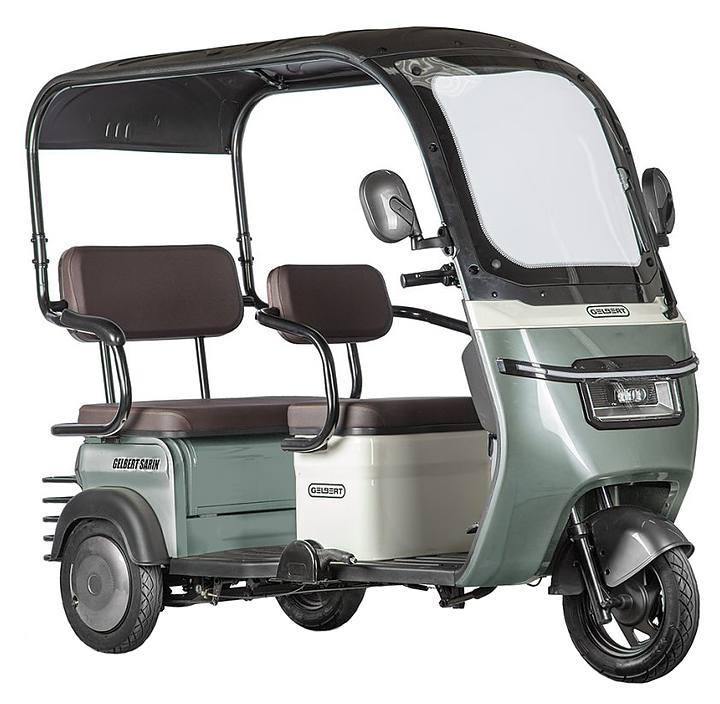 Трицикл Rutrike Gelbert Sarin используется для комфортного передвижения по городу, загородным территориям и курортам. Модель оснащена крышей для защиты от солнца и непогоды, 2 рядами сидений с подлокотниками и спинками, корзиной сзади, задним приводом и барабанными передними и задними тормозами. Широкие колеса гарантируют устойчивость и плавность хода даже на неровных поверхностях. Аккумуляторные батареи и зарядное устройство в комплект поставки не входят. Дополнительные характеристики: